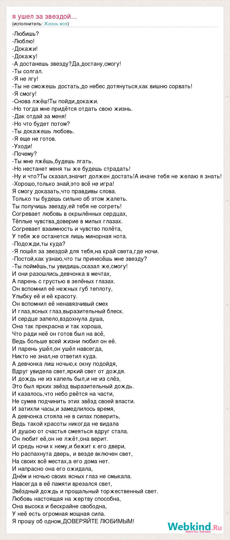 -Любишь? -Люблю! -Докажи! -Докажу! -А достанешь звезду?Да,достану,смогу! -Ты солгал. -Я не лгу! -Ты не сможешь достать,до небес дотянуться,как вишню сорвать! -Я смогу! -Снова лжёш!Ты пойди,докажи. -Но тогда мне придётся отдать свою жизнь. -Дак отдай за меня! -Но что будет потом? -Ты докажешь любовь. -Я еще не готов. -Уходи! -Почему? -Ты мне лжёшь,будешь лгать. -Но нестанет меня ты же будешь страдать! -Ну и что?Ты сказал,значит должен достать!А иначе тебя не желаю я знать! -Хорошо,только знай,это всё не игра! Я смогу доказать,что правдивы слова. Только ты будешь сильно об этом жалеть. Ты получишь звезду,ей тебя не согреть! Согревает любовь в окрылённых сердцах, Тёплые чувства,доверие в милых глазах. Согревает взаимность и чувство полёта, У тебя же останется лишь минорная нота. -Подожди,ты куда? -Я пошёл за звездой для тебя,на край света,где ночи. -Постой,как узнаю,что ты принесёшь мне звезду? -Ты поймёшь,ты увидишь,сказал же,смогу! И они разошлись,девчонка в мечтах, А парень с грустью в зелёных глазах. Он вспомнил её нежных губ теплоту, Улыбку её и её красоту. Он вспомнил её ненавязчивый смех И глаз,ясных глаз,выразительный блеск. И сердце запело,вздохнула душа, Она так прекрасна и так хороша, Что ради неё он готов был на всё, Ведь больше всей жизни любил он её. И парень ушёл,он ушёл навсегда, Никто не знал,не ответил куда. А девчонка лиш ночью,к окну подойдя, Вдруг увидела свет,яркий свет от дождя. И дождь не из капель был,и не из слёз, Это был ярких звёзд выразительный дождь. И казалось,что небо рвётся на части, Не сумев подчинить этих звёзд своей власти. И затихли часы,и замедлилось время, А девчонка стояла не в силах поверить, Ведь такой красоты никогда не видала И душою от счастья смеяться вдруг стала. Он любит её,он не лжёт,она верит. И средь ночи к нему,и бежит к его двери, Но распахнута дверь, и везде включен свет, На своих всё местах,а его дома нет. И напрасно она его ожидала, Днём и ночью своих ясных глаз не смыкала. Навсегда в её памяти врезался свет, Звёздный дождь и прощальный торжественный свет. Любовь настоящая на жертву способна, Она высока и бескрайне свободна, У неё есть огромная мощная сила. Я прошу об одном,ДОВЕРЯЙТЕ ЛЮБИМЫМ!