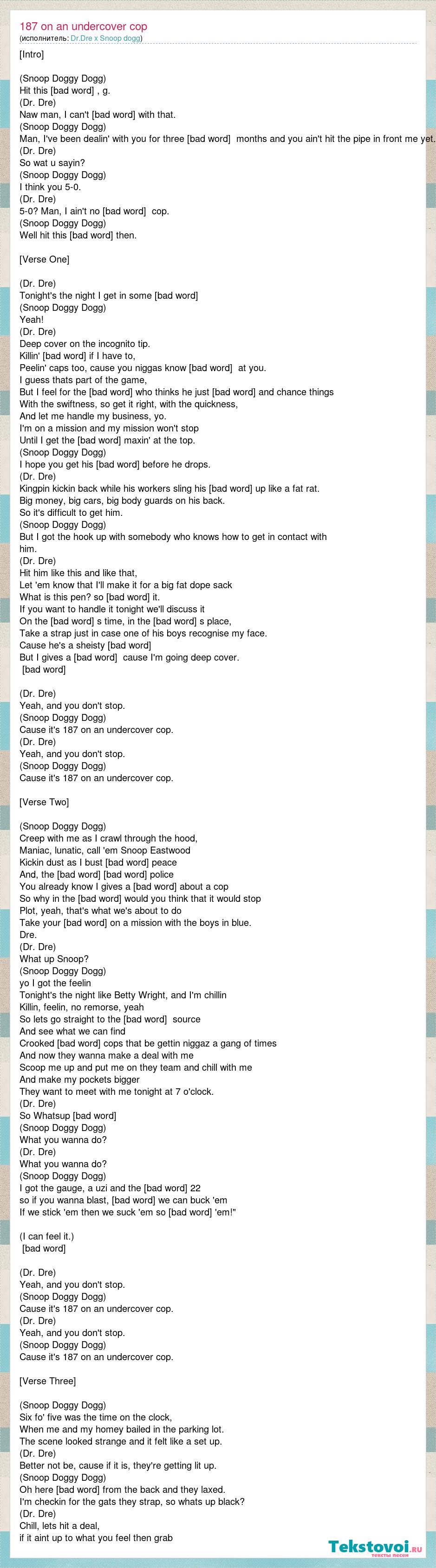 [Intro] (Snoop Doggy Dogg) Hit this [bad word] , g. (Dr. Dre) Naw man, I can't [bad word] with that. (Snoop Doggy Dogg) Man, I've been dealin' with you for three [bad word] months and you ain't hit the pipe in front me yet. (Dr. Dre) So wat u sayin? (Snoop Doggy Dogg) I think you 5-0. (Dr. Dre) 5-0? Man, I ain't no [bad word] cop. (Snoop Doggy Dogg) Well hit this [bad word] then. [Verse One] (Dr. Dre) Tonight's the night I get in some [bad word] (Snoop Doggy Dogg) Yeah! (Dr. Dre) Deep cover on the incognito tip. Killin' [bad word] if I have to, Peelin' caps too, cause you niggas know I'm comin' at you. I guess thats part of the game, But I feel for the [bad word] who thinks he just gonna come and chance things With the swiftness, so get it right, with the quickness, And let me handle my business, yo. I'm on a mission and my mission won't stop Until I get the [bad word] maxin' at the top. (Snoop Doggy Dogg) I hope you get his [bad word] before he drops. (Dr. Dre) Kingpin kickin back while his workers sling his rocks. Coming up like a fat rat. Big money, big cars, big body guards on his back. So it's difficult to get him. (Snoop Doggy Dogg) But I got the hook up with somebody who knows how to get in contact with him. (Dr. Dre) Hit him like this and like that, Let 'em know that I'll make it for a big fat dope sack What is this pen? so let's rush it. If you want to handle it tonight we'll discuss it On the [bad word] s time, in the [bad word] s place, Take a strap just in case one of his boys recognise my face. Cause he's a sheisty [bad word] But I gives a [bad word] cause I'm going deep cover. [Chorus] (Dr. Dre) Yeah, and you don't stop. (Snoop Doggy Dogg) Cause it's 187 on an undercover cop. (Dr. Dre) Yeah, and you don't stop. (Snoop Doggy Dogg) Cause it's 187 on an undercover cop. [Verse Two] (Snoop Doggy Dogg) Creep with me as I crawl through the hood, Maniac, lunatic, call 'em Snoop Eastwood Kickin dust as I bust [bad word] peace And, the [bad word] drug police You already know I gives a [bad word] about a cop So why in the [bad word] would you think that it would stop Plot, yeah, that's what we's about to do Take your [bad word] on a mission with the boys in blue. Dre. (Dr. Dre) What up Snoop? (Snoop Doggy Dogg) yo I got the feelin Tonight's the night like Betty Wright, and I'm chillin Killin, feelin, no remorse, yeah So lets go straight to the [bad word] source And see what we can find Crooked [bad word] cops that be gettin niggaz a gang of times And now they wanna make a deal with me Scoop me up and put me on they team and chill with me And make my pockets bigger They want to meet with me tonight at 7 o'clock. (Dr. Dre) So Whatsup [bad word] (Snoop Doggy Dogg) What you wanna do? (Dr. Dre) What you wanna do? (Snoop Doggy Dogg) I got the gauge, a uzi and the [bad word] 22 so if you wanna blast, [bad word] we can buck 'em If we stick 'em then we suck 'em so [bad word] 'em!" (I can feel it.) [Chorus] (Dr. Dre) Yeah, and you don't stop. (Snoop Doggy Dogg) Cause it's 187 on an undercover cop. (Dr. Dre) Yeah, and you don't stop. (Snoop Doggy Dogg) Cause it's 187 on an undercover cop. [Verse Three] (Snoop Doggy Dogg) Six fo' five was the time on the clock, When me and my homey bailed in the parking lot. The scene looked strange and it felt like a set up. (Dr. Dre) Better not be, cause if it is, they're getting lit up. (Snoop Doggy Dogg) Oh here they come from the back and they laxed. I'm checkin for the gats they strap, so whats up black? (Dr. Dre) Chill, lets hit a deal, if it aint up to what you feel then grab