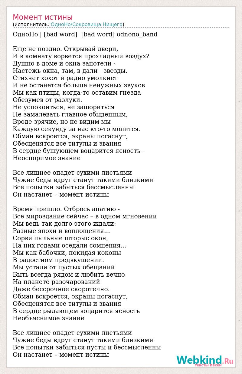 ОдноНо | [bad word] [bad word] odnono_band Еще не поздно. Открывай двери, И в комнату ворвется прохладный воздух? Душно в доме и окна запотели - Настежь окна, там, в дали - звезды. Стихнет хохот и радио умолкнет И не останется больше ненужных звуков Мы как птицы, когда-то оставим гнезда Обезумев от разлуки. Не успокоиться, не зашориться Не замалевать главное обыденным, Вроде зрячие, но не видим мы Каждую секунду за нас кто-то молится. Обман вскроется, экраны погаснут, Обесценятся все титулы и звания В сердце бушующем воцарится ясность - Неоспоримое знание Все лишнее опадет сухими листьями Чужие беды вдруг станут такими близкими Все попытки забыться бессмысленны Он настанет – момент истины Время пришло. Отбрось апатию - Все мироздание сейчас – в одном мгновении Мы ведь так долго этого ждали: Разные эпохи и воплощения… Сорви пыльные шторыс окон, На них годами оседали сомнения… Мы как бабочки, покидая коконы В радостном предвкушении. Мы устали от пустых обещаний Быть всегда рядом и любить вечно На планете разочарований Даже бессрочное скоротечно. Обман вскроется, экраны погаснут, Обесценятся все титулы и звания В сердце рыдающем воцарится ясность Необъяснимое знание Все лишнее опадет сухими листьями Чужие беды вдруг станут такими близкими Все попытки забыться пусты и бессмысленны Он настанет – момент истины