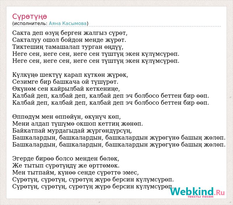 Сакта деп өзүң берген жалгыз сүрөт, Сакталуу ошол бойдон менде жүрөт. Тиктешиң тамашалап турган өңдүү, Неге сен, неге сен, неге сен түштүң экен күлүмсүрөп. Неге сен, неге сен, неге сен түштүң экен күлүмсүрөп. Күлкүңө шектүү карап күткөн жүрөк, Сезимге бир башкача ой түшүрөт. Өкүнөм сен кайрылбай кеткениңе, Калбай деп, калбай деп, калбай деп эч болбосо беттен бир өөп. Калбай деп, калбай деп, калбай деп эч болбосо беттен бир өөп. Өппөдүм мен өппөйүн, өкүнүч көп, Мени алдап түшүмө окшоп кеттиң жөнөп. Байкатпай мурдагыдай жүргөндүрсүң, Башкалардын, башкалардын, башкалардын жүрөгүнө башың жөлөп. Башкалардын, башкалардын, башкалардын жүрөгүнө башың жөлөп. Эгерде бирөө болсо менден бөлөк, Же тытып сүрөтүңдү же өрттөмөк. Мен тытпайм, күнөө сенде сүрөттө эмес, Сүрөтүң, сүрөтүң, сүрөтүң жүрө берсин күлүмсүрөп. Сүрөтүң, сүрөтүң, сүрөтүң жүрө берсин күлүмсүрөп.
