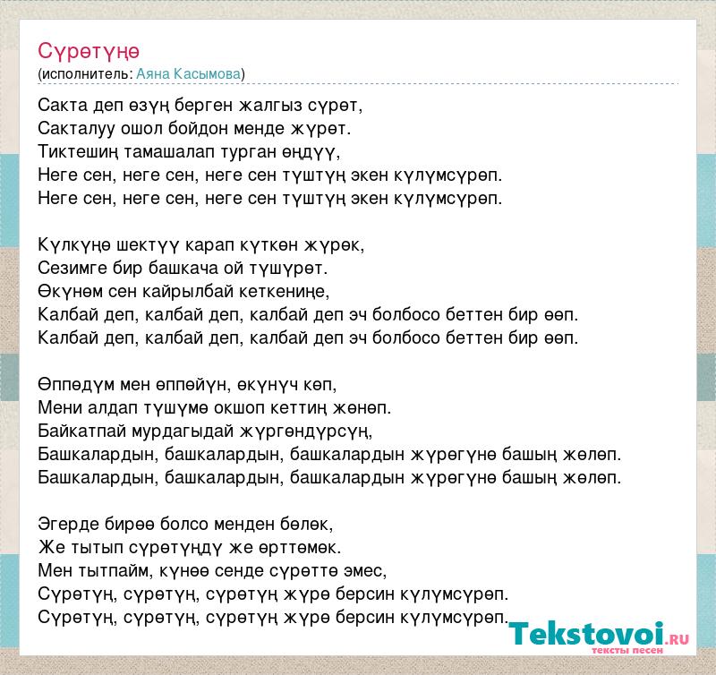 Сакта деп өзүң берген жалгыз сүрөт, Сакталуу ошол бойдон менде жүрөт. Тиктешиң тамашалап турган өңдүү, Неге сен, неге сен, неге сен түштүң экен күлүмсүрөп. Неге сен, неге сен, неге сен түштүң экен күлүмсүрөп. Күлкүңө шектүү карап күткөн жүрөк, Сезимге бир башкача ой түшүрөт. Өкүнөм сен кайрылбай кеткениңе, Калбай деп, калбай деп, калбай деп эч болбосо беттен бир өөп. Калбай деп, калбай деп, калбай деп эч болбосо беттен бир өөп. Өппөдүм мен өппөйүн, өкүнүч көп, Мени алдап түшүмө окшоп кеттиң жөнөп. Байкатпай мурдагыдай жүргөндүрсүң, Башкалардын, башкалардын, башкалардын жүрөгүнө башың жөлөп. Башкалардын, башкалардын, башкалардын жүрөгүнө башың жөлөп. Эгерде бирөө болсо менден бөлөк, Же тытып сүрөтүңдү же өрттөмөк. Мен тытпайм, күнөө сенде сүрөттө эмес, Сүрөтүң, сүрөтүң, сүрөтүң жүрө берсин күлүмсүрөп. Сүрөтүң, сүрөтүң, сүрөтүң жүрө берсин күлүмсүрөп.