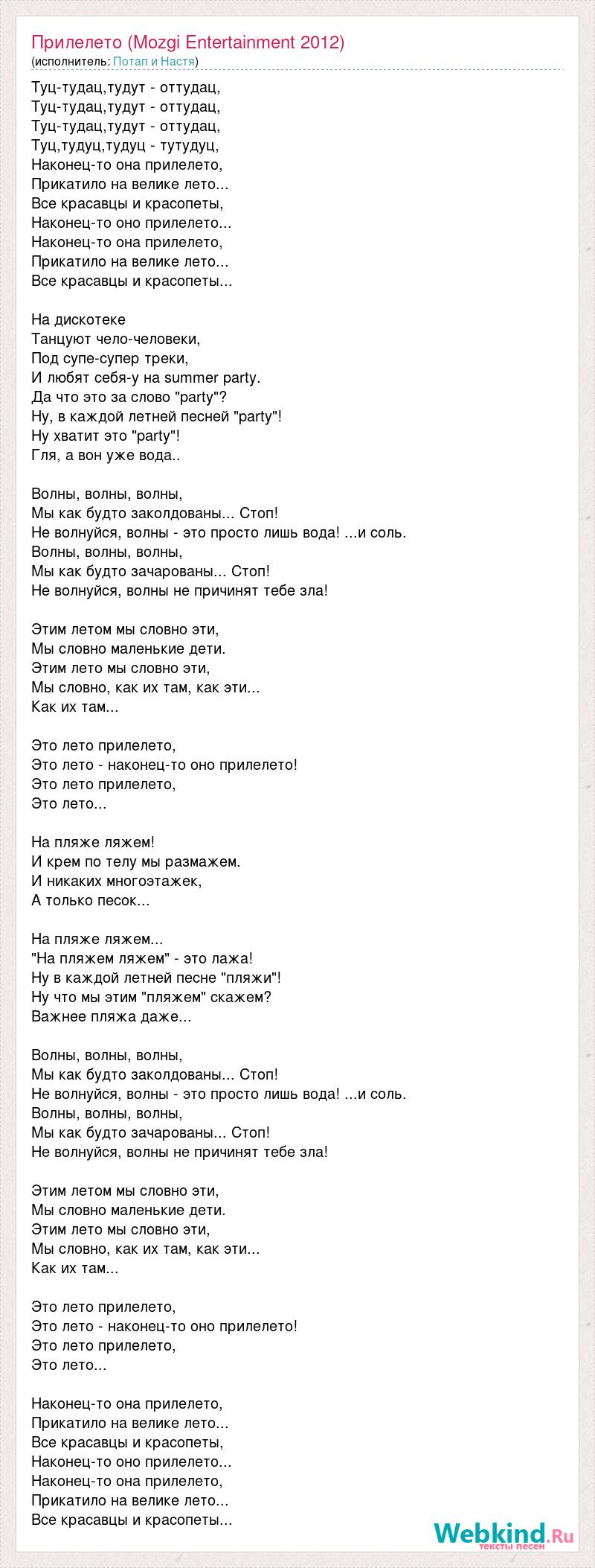 Туц-тудац,тудут - оттудац, Туц-тудац,тудут - оттудац, Туц-тудац,тудут - оттудац, Туц,тудуц,тудуц - тутудуц, Наконец-то она прилелето, Прикатило на велике лето... Все красавцы и красопеты, Наконец-то оно прилелето... Наконец-то она прилелето, Прикатило на велике лето... Все красавцы и красопеты... На дискотеке Танцуют чело-человеки, Под супе-супер треки, И любят себя-у на summer party. Да что это за слово "party"? Ну, в каждой летней песней "party"! Ну хватит это "party"! Гля, а вон уже вода.. Волны, волны, волны, Мы как будто заколдованы... Стоп! Не волнуйся, волны - это просто лишь вода! ...и соль. Волны, волны, волны, Мы как будто зачарованы... Стоп! Не волнуйся, волны не причинят тебе зла! Этим летом мы словно эти, Мы словно маленькие дети. Этим лето мы словно эти, Мы словно, как их там, как эти... Как их там... Это лето прилелето, Это лето - наконец-то оно прилелето! Это лето прилелето, Это лето... На пляже ляжем! И крем по телу мы размажем. И никаких многоэтажек, А только песок... На пляже ляжем... "На пляжем ляжем" - это лажа! Ну в каждой летней песне "пляжи"! Ну что мы этим "пляжем" скажем? Важнее пляжа даже... Волны, волны, волны, Мы как будто заколдованы... Стоп! Не волнуйся, волны - это просто лишь вода! ...и соль. Волны, волны, волны, Мы как будто зачарованы... Стоп! Не волнуйся, волны не причинят тебе зла! Этим летом мы словно эти, Мы словно маленькие дети. Этим лето мы словно эти, Мы словно, как их там, как эти... Как их там... Это лето прилелето, Это лето - наконец-то оно прилелето! Это лето прилелето, Это лето... Наконец-то она прилелето, Прикатило на велике лето... Все красавцы и красопеты, Наконец-то оно прилелето... Наконец-то она прилелето, Прикатило на велике лето... Все красавцы и красопеты...