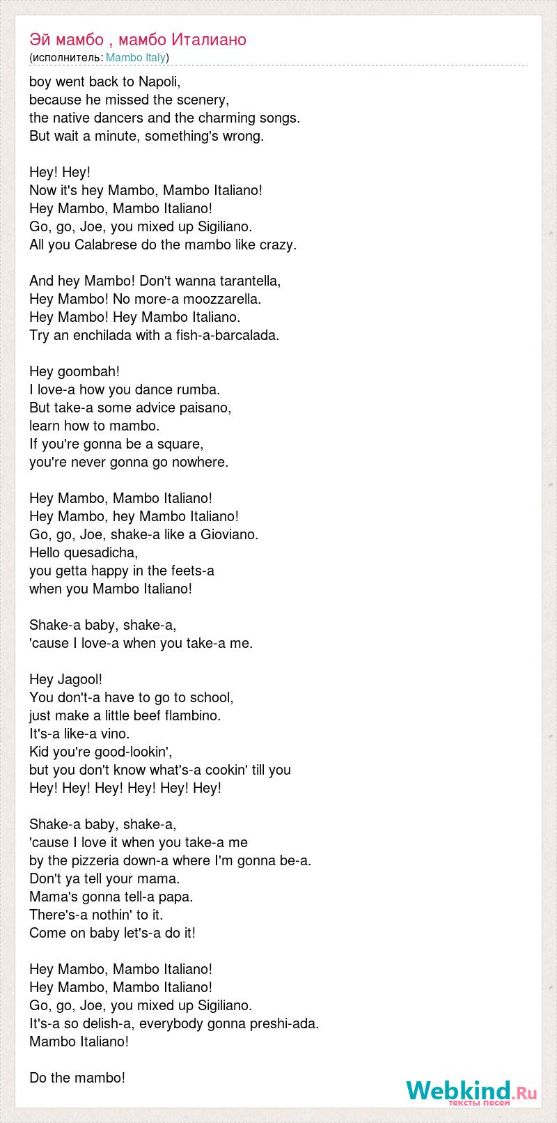 boy went back to Napoli, because he missed the scenery, the native dancers and the charming songs. But wait a minute, something's wrong. Hey! Hey! Now it's hey Mambo, Mambo Italiano! Hey Mambo, Mambo Italiano! Go, go, Joe, you mixed up Sigiliano. All you Calabrese do the mambo like crazy. And hey Mambo! Don't wanna tarantella, Hey Mambo! No more-a moozzarella. Hey Mambo! Hey Mambo Italiano. Try an enchilada with a fish-a-barcalada. Hey goombah! I love-a how you dance rumba. But take-a some advice paisano, learn how to mambo. If you're gonna be a square, you're never gonna go nowhere. Hey Mambo, Mambo Italiano! Hey Mambo, hey Mambo Italiano! Go, go, Joe, shake-a like a Gioviano. Hello quesadicha, you getta happy in the feets-a when you Mambo Italiano! Shake-a baby, shake-a, 'cause I love-a when you take-a me. Hey Jagool! You don't-a have to go to school, just make a little beef flambino. It's-a like-a vino. Kid you're good-lookin', but you don't know what's-a cookin' till you Hey! Hey! Hey! Hey! Hey! Hey! Shake-a baby, shake-a, 'cause I love it when you take-a me by the pizzeria down-a where I'm gonna be-a. Don't ya tell your mama. Mama's gonna tell-a papa. There's-a nothin' to it. Come on baby let's-a do it! Hey Mambo, Mambo Italiano! Hey Mambo, Mambo Italiano! Go, go, Joe, you mixed up Sigiliano. It's-a so delish-a, everybody gonna preshi-ada. Mambo Italiano! Do the mambo!