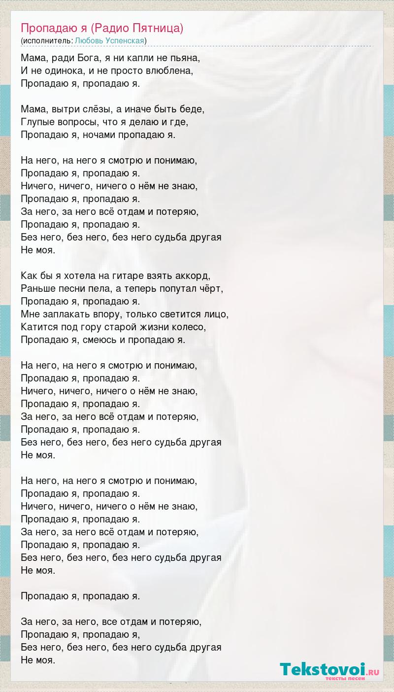 Мама, ради Бога, я ни капли не пьяна, И не одинока, и не просто влюблена, Пропадаю я, пропадаю я. Мама, вытри слёзы, а иначе быть беде, Глупые вопросы, что я делаю и где, Пропадаю я, ночами пропадаю я. На него, на него я смотрю и понимаю, Пропадаю я, пропадаю я. Ничего, ничего, ничего о нём не знаю, Пропадаю я, пропадаю я. За него, за него всё отдам и потеряю, Пропадаю я, пропадаю я. Без него, без него, без него судьба другая Не моя. Как бы я хотела на гитаре взять аккорд, Раньше песни пела, а теперь попутал чёрт, Пропадаю я, пропадаю я. Мне заплакать впору, только светится лицо, Катится под гору старой жизни колесо, Пропадаю я, смеюсь и пропадаю я. На него, на него я смотрю и понимаю, Пропадаю я, пропадаю я. Ничего, ничего, ничего о нём не знаю, Пропадаю я, пропадаю я. За него, за него всё отдам и потеряю, Пропадаю я, пропадаю я. Без него, без него, без него судьба другая Не моя. На него, на него я смотрю и понимаю, Пропадаю я, пропадаю я. Ничего, ничего, ничего о нём не знаю, Пропадаю я, пропадаю я. За него, за него всё отдам и потеряю, Пропадаю я, пропадаю я. Без него, без него, без него судьба другая Не моя. Пропадаю я, пропадаю я. За него, за него, все отдам и потеряю, Пропадаю я, пропадаю я, Без него, без него, без него судьба другая Не моя.