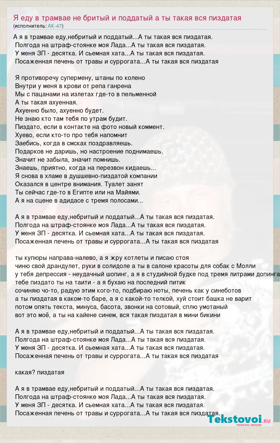 А я в трамвае еду,небритый и поддатый...А ты такая вся пиздатая. Полгода на штраф-стоянке моя Лада...А ты такая вся пиздатая. У меня ЗП - десятка. И сьемная хата...А ты такая вся пиздатая. Посаженная печень от травы и суррогата...А ты такая вся пиздатая Я противоречу супермену, штаны по колено Внутри у меня в крови от репа ганрена Мы с пацанами на излетах где-то в пельменной А ты такая ахуенная. Ахуенно было, ахуенно будет. Не знаю кто там тебя по утрам будит. Пиздато, если в контакте на фото новый коммент. Хуево, если кто-то про тебя напомнит Заебись, когда в смсках поздравляешь. Подарков не даришь, но настроение поднимаешь. Значит не забыла, значит помнишь. Знаешь, приятно, когда на перезвон кидаешь... Я снова в хламе в душшевно-пиздатой компании Оказался в центре внимания. Туалет занят Ты сейчас где-то в Египте или на Майями. А я на сцене в адидасе с тремя полосами... А я в трамвае еду,небритый и поддатый...А ты такая вся пиздатая. Полгода на штраф-стоянке моя Лада...А ты такая вся пиздатая. У меня ЗП - десятка. И сьемная хата...А ты такая вся пиздатая. Посаженная печень от травы и суррогата...А ты такая вся пиздатая ты купюры направа-налево, а я жру котлеты и писаю стоя чиню свой драндулет, руки в солидоле а ты в салоне красоты для собак с Молли у тебя депрессия - неудачный шопинг, а я в студийной будке под тремя литрами допинга тебе пиздато ты на таити - а я бухаю на последний питик сочиняю чо-то, радую этим кого-то, подбираю ноты, печень как у синеботов а ты пиздатая в каком-то баре, а я с какой-то телкой, хуй стоит башка не варит потом опять текста, минуса, басота, звонки на сотовый, сплю умотаный вот это моё, а ты на кайене синем, вся такая пиздатая в мини бикини А я в трамвае еду,небритый и поддатый...А ты такая вся пиздатая. Полгода на штраф-стоянке моя Лада...А ты такая вся пиздатая. У меня ЗП - десятка. И сьемная хата...А ты такая вся пиздатая. Посаженная печень от травы и суррогата...А ты такая вся пиздатая какая? пиздатая А я в трамвае еду,небритый и поддатый...А ты такая вся пиздатая. Полгода на штраф-стоянке моя Лада...А ты такая вся пиздатая. У меня ЗП - десятка. И сьемная хата...А ты такая вся пиздатая. Посаженная печень от травы и суррогата...А ты такая вся пиздатая.