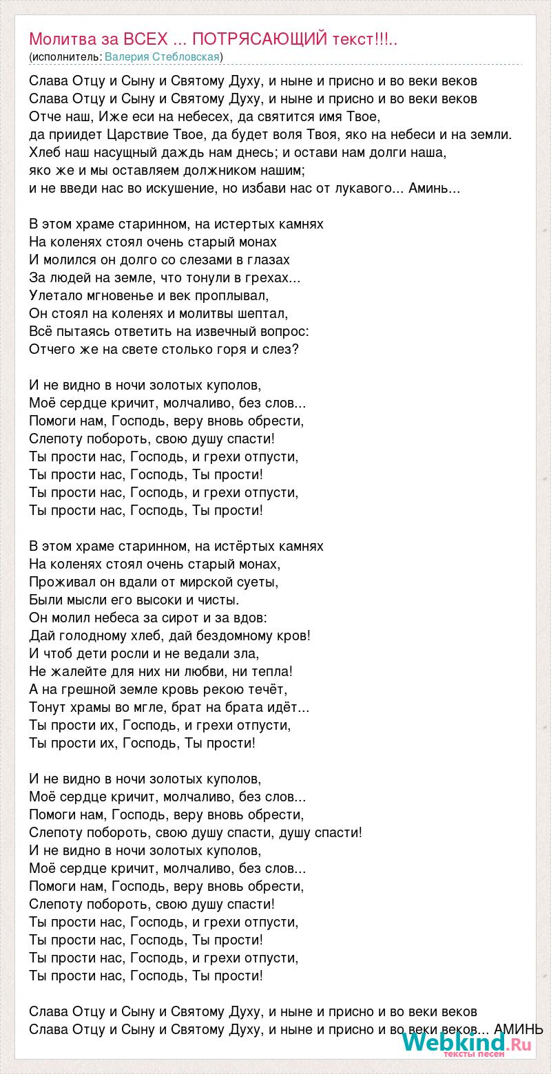 Слава Отцу и Сыну и Святому Духу, и ныне и присно и во веки веков Слава Отцу и Сыну и Святому Духу, и ныне и присно и во веки веков Отче наш, Иже еси на небесех, да святится имя Твое, да приидет Царствие Твое, да будет воля Твоя, яко на небеси и на земли. Хлеб наш насущный даждь нам днесь; и остави нам долги наша, яко же и мы оставляем должником нашим; и не введи нас во искушение, но избави нас от лукавого... Аминь... В этом храме старинном, на истертых камнях На коленях стоял очень старый монах И молился он долго со слезами в глазах За людей на земле, что тонули в грехах... Улетало мгновенье и век проплывал, Он стоял на коленях и молитвы шептал, Всё пытаясь ответить на извечный вопрос: Отчего же на свете столько горя и слез? И не видно в ночи золотых куполов, Моё сердце кричит, молчаливо, без слов... Помоги нам, Господь, веру вновь обрести, Слепоту побороть, свою душу спасти! Ты прости нас, Господь, и грехи отпусти, Ты прости нас, Господь, Ты прости! Ты прости нас, Господь, и грехи отпусти, Ты прости нас, Господь, Ты прости! В этом храме старинном, на истёртых камнях На коленях стоял очень старый монах, Проживал он вдали от мирской суеты, Были мысли его высоки и чисты. Он молил небеса за сирот и за вдов: Дай голодному хлеб, дай бездомному кров! И чтоб дети росли и не ведали зла, Не жалейте для них ни любви, ни тепла! А на грешной земле кровь рекою течёт, Тонут храмы во мгле, брат на брата идёт... Ты прости их, Господь, и грехи отпусти, Ты прости их, Господь, Ты прости! И не видно в ночи золотых куполов, Моё сердце кричит, молчаливо, без слов... Помоги нам, Господь, веру вновь обрести, Слепоту побороть, свою душу спасти, душу спасти! И не видно в ночи золотых куполов, Моё сердце кричит, молчаливо, без слов... Помоги нам, Господь, веру вновь обрести, Слепоту побороть, свою душу спасти! Ты прости нас, Господь, и грехи отпусти, Ты прости нас, Господь, Ты прости! Ты прости нас, Господь, и грехи отпусти, Ты прости нас, Господь, Ты прости! Слава Отцу и Сыну и Святому Духу, и ныне и присно и во веки веков Слава Отцу и Сыну и Святому Духу, и ныне и присно и во веки веков... АМИНЬ