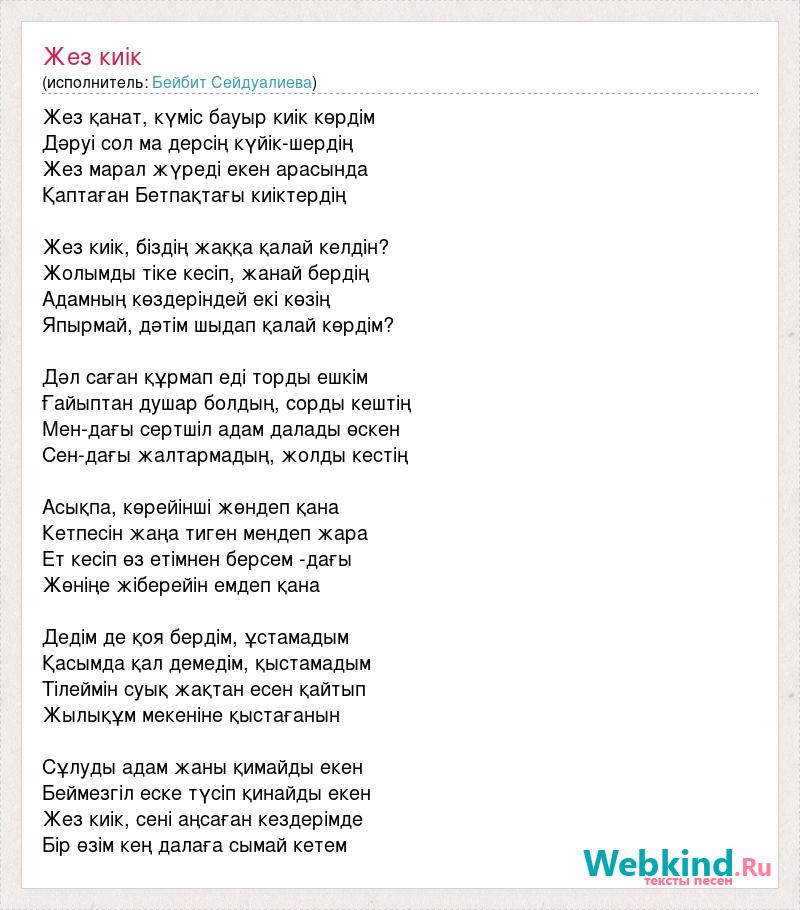 Жез қанат, күміс бауыр киік көрдім Дәруі сол ма дерсің күйік-шердің Жез марал жүреді екен арасында Қаптаған Бетпақтағы киіктердің Жез киік, біздің жаққа қалай келдін? Жолымды тіке кесіп, жанай бердің Адамның көздеріндей екі көзің Япырмай, дәтім шыдап қалай көрдім? Дәл саған құрмап еді торды ешкім Ғайыптан душар болдың, сорды кештің Мен-дағы сертшіл адам далады өскен Сен-дағы жалтармадың, жолды кестің Асықпа, көрейінші жөндеп қана Кетпесін жаңа тиген мендеп жара Ет кесіп өз етімнен берсем -дағы Жөніңе жіберейін емдеп қана Дедім де қоя бердім, ұстамадым Қасымда қал демедім, қыстамадым Тілеймін суық жақтан есен қайтып Жылықұм мекеніне қыстағанын Сұлуды адам жаны қимайды екен Беймезгіл еске түсіп қинайды екен Жез киік, сені аңсаған кездерімде Бір өзім кең далаға сымай кетем