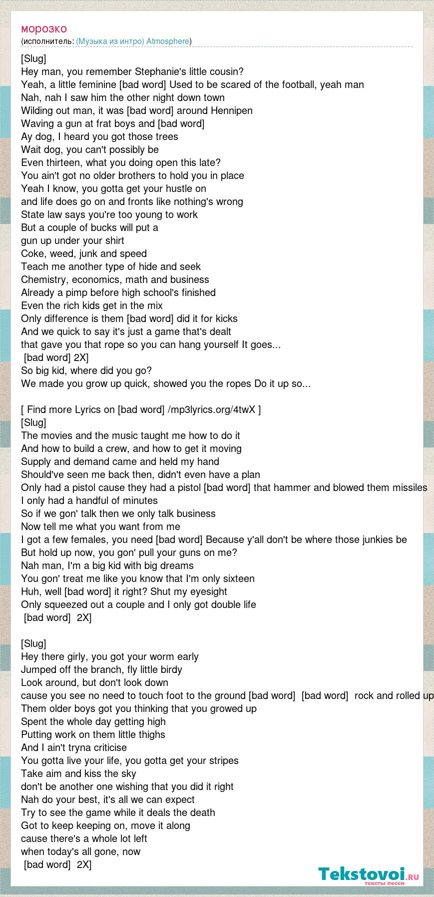 [Slug] Hey man, you remember Stephanie's little cousin? Yeah, a little feminine [bad word] Used to be scared of the football, yeah man Nah, nah I saw him the other night down town Wilding out man, it was crazy Running around Hennipen Waving a gun at frat boys and [bad word] Ay dog, I heard you got those trees Wait dog, you can't possibly be Even thirteen, what you doing open this late? You ain't got no older brothers to hold you in place Yeah I know, you gotta get your hustle on and life does go on and fronts like nothing's wrong State law says you're too young to work But a couple of bucks will put a gun up under your shirt Coke, weed, junk and speed Teach me another type of hide and seek Chemistry, economics, math and business Already a pimp before high school's finished Even the rich kids get in the mix Only difference is them [bad word] did it for kicks And we quick to say it's just a game that's dealt that gave you that rope so you can hang yourself It goes... [Chorus 2X] So big kid, where did you go? We made you grow up quick, showed you the ropes Do it up so... [ Find more Lyrics on [bad word] /mp3lyrics.org/4twX ] [Slug] The movies and the music taught me how to do it And how to build a crew, and how to get it moving Supply and demand came and held my hand Should've seen me back then, didn't even have a plan Only had a pistol cause they had a pistol [bad word] that hammer and blowed them missiles I only had a handful of minutes So if we gon' talk then we only talk business Now tell me what you want from me I got a few females, you need some company Because y'all don't be where those junkies be But hold up now, you gon' pull your guns on me? Nah man, I'm a big kid with big dreams You gon' treat me like you know that I'm only sixteen Huh, well [bad word] it right? Shut my eyesight Only squeezed out a couple and I only got double life [Chorus: 2X] [Slug] Hey there girly, you got your worm early Jumped off the branch, fly little birdy Look around, but don't look down cause you see no need to touch foot to the ground [bad word] drugs, rock and rolled up Them older boys got you thinking that you growed up Spent the whole day getting high Putting work on them little thighs And I ain't tryna criticise You gotta live your life, you gotta get your stripes Take aim and kiss the sky don't be another one wishing that you did it right Nah do your best, it's all we can expect Try to see the game while it deals the death Got to keep keeping on, move it along cause there's a whole lot left when today's all gone, now [Chorus: 2X]