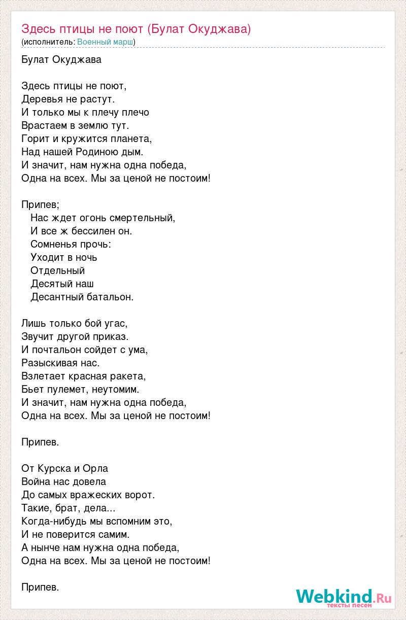 Булат Окуджава Здесь птицы не поют, Деревья не растут. И только мы к плечу плечо Врастаем в землю тут. Горит и кружится планета, Над нашей Родиною дым. И значит, нам нужна одна победа, Одна на всех. Мы за ценой не постоим! Припев; Нас ждет огонь смертельный, И все ж бессилен он. Сомненья прочь: Уходит в ночь Отдельный Десятый наш Десантный батальон. Лишь только бой угас, Звучит другой приказ. И почтальон сойдет с ума, Разыскивая нас. Взлетает красная ракета, Бьет пулемет, неутомим. И значит, нам нужна одна победа, Одна на всех. Мы за ценой не постоим! Припев. От Курска и Орла Война нас довела До самых вражеских ворот. Такие, брат, дела... Когда-нибудь мы вспомним это, И не поверится самим. А нынче нам нужна одна победа, Одна на всех. Мы за ценой не постоим! Припев.