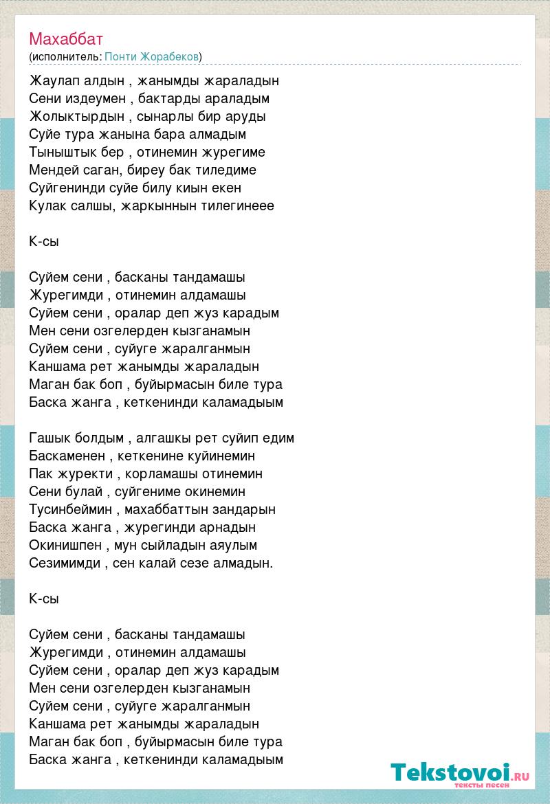 Жаулап алдын , жанымды жараладын Сени издеумен , бактарды араладым Жолыктырдын , сынарлы бир аруды Суйе тура жанына бара алмадым Тыныштык бер , отинемин журегиме Мендей саган, биреу бак тиледиме Суйгенинди суйе билу киын екен Кулак салшы, жаркыннын тилегинеее К-сы Суйем сени , басканы тандамашы Журегимди , отинемин алдамашы Суйем сени , оралар деп жуз карадым Мен сени озгелерден кызганамын Суйем сени , суйуге жаралганмын Каншама рет жанымды жараладын Маган бак боп , буйырмасын биле тура Баска жанга , кеткенинди каламадыым Гашык болдым , алгашкы рет суйип едим Баскаменен , кеткенине куйинемин Пак журекти , корламашы отинемин Сени булай , суйгениме окинемин Тусинбеймин , махаббаттын зандарын Баска жанга , журегинди арнадын Окинишпен , мун сыйладын аяулым Сезимимди , сен калай сезе алмадын. К-сы Суйем сени , басканы тандамашы Журегимди , отинемин алдамашы Суйем сени , оралар деп жуз карадым Мен сени озгелерден кызганамын Суйем сени , суйуге жаралганмын Каншама рет жанымды жараладын Маган бак боп , буйырмасын биле тура Баска жанга , кеткенинди каламадыым