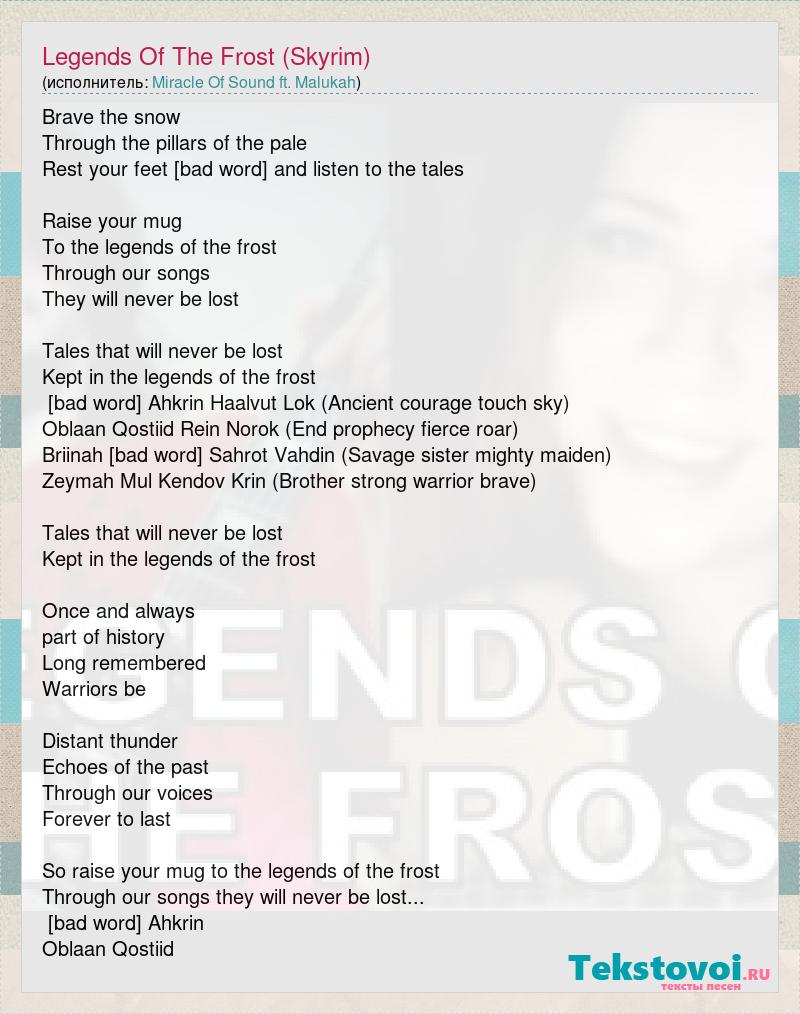 Brave the snow Through the pillars of the pale Rest your feet Come and listen to the tales Raise your mug To the legends of the frost Through our songs They will never be lost Tales that will never be lost Kept in the legends of the frost Kruziik Ahkrin Haalvut Lok (Ancient courage touch sky) Oblaan Qostiid Rein Norok (End prophecy fierce roar) Briinah Bruniik Sahrot Vahdin (Savage sister mighty maiden) Zeymah Mul Kendov Krin (Brother strong warrior brave) Tales that will never be lost Kept in the legends of the frost Once and always part of history Long remembered Warriors be Distant thunder Echoes of the past Through our voices Forever to last So raise your mug to the legends of the frost Through our songs they will never be lost... Kruziik Ahkrin Oblaan Qostiid