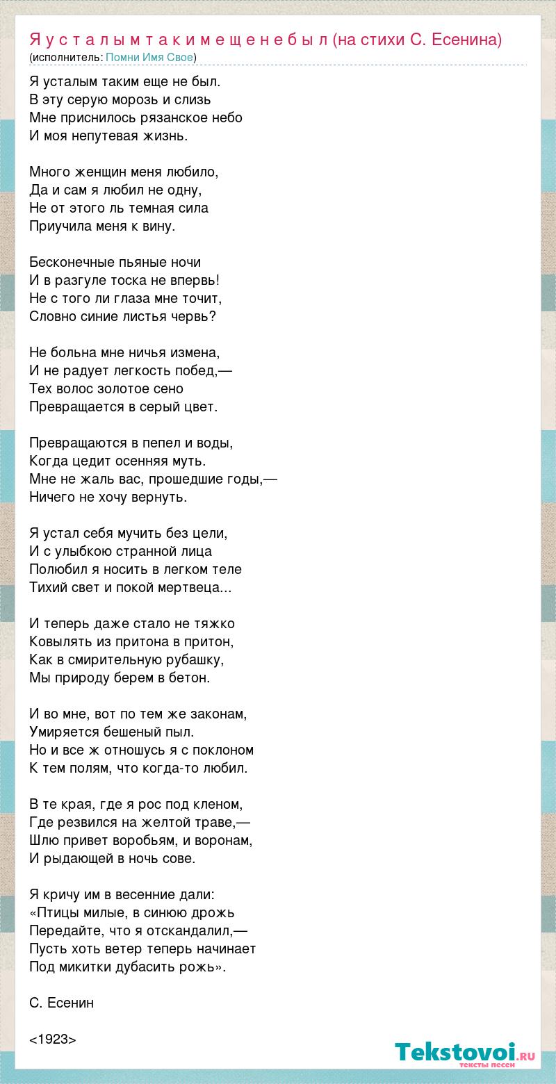 Я усталым таким еще не был. В эту серую морозь и слизь Мне приснилось рязанское небо И моя непутевая жизнь. Много женщин меня любило, Да и сам я любил не одну, Не от этого ль темная сила Приучила меня к вину. Бесконечные пьяные ночи И в разгуле тоска не впервь! Не с того ли глаза мне точит, Словно синие листья червь? Не больна мне ничья измена, И не радует легкость побед,— Тех волос золотое сено Превращается в серый цвет. Превращаются в пепел и воды, Когда цедит осенняя муть. Мне не жаль вас, прошедшие годы,— Ничего не хочу вернуть. Я устал себя мучить без цели, И с улыбкою странной лица Полюбил я носить в легком теле Тихий свет и покой мертвеца... И теперь даже стало не тяжко Ковылять из притона в притон, Как в смирительную рубашку, Мы природу берем в бетон. И во мне, вот по тем же законам, Умиряется бешеный пыл. Но и все ж отношусь я с поклоном К тем полям, что когда-то любил. В те края, где я рос под кленом, Где резвился на желтой траве,— Шлю привет воробьям, и воронам, И рыдающей в ночь сове. Я кричу им в весенние дали: «Птицы милые, в синюю дрожь Передайте, что я отскандалил,— Пусть хоть ветер теперь начинает Под микитки дубасить рожь». С. Есенин <1923>