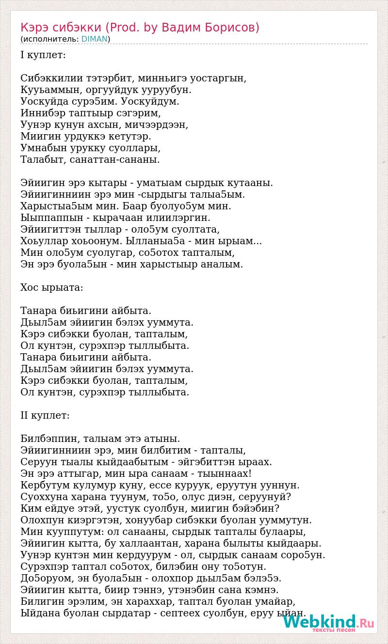 I куплет: Сибэккилии тэтэрбит, минньигэ уостаргын, Кууьаммын, оргууйдук ууруубун. Уоскуйда сурэ5им. Уоскуйдум. Иннибэр таптыыр сэгэрим, Уунэр кунун ахсын, мичээрдээн, Миигин урдуккэ кетутэр. Умнабын урукку суоллары, Талабыт, санаттан-сананы. Эйиигин эрэ кытары - уматыам сырдык кутааны. Эйиигинниин эрэ мин -сырдыгы талыа5ым. Харыстыа5ым мин. Баар буолуо5ум мин. Ыыппаппын - кырачаан илиилэргин. Эйиигиттэн тыллар - оло5ум суолтата, Хоьуллар хоьоонум. Ылланыа5а - мин ырыам... Мин оло5ум суолугар, со5отох тапталым, Эн эрэ буола5ын - мин харыстыыр аналым. Хос ырыата: Танара биьигини айбыта. Дьыл5ам эйиигин бэлэх ууммута. Кэрэ сибэкки буолан, тапталым, Ол кунтэн, сурэхпэр тыллыбыта. Танара биьигини айбыта. Дьыл5ам эйиигин бэлэх ууммута. Кэрэ сибэкки буолан, тапталым, Ол кунтэн, сурэхпэр тыллыбыта. II куплет: Билбэппин, талыам этэ атыны. Эйиигинниин эрэ, мин билбитим - тапталы, Серуун тыалы кыйдаабытым - эйгэбиттэн ыраах. Эн эрэ аттыгар, мин ыра санаам - тыыннаах! Кербутум кулумур куну, ессе куруук, еруутун ууннун. Суоххуна харана туунум, то5о, олус диэн, серуунуй? Ким ейдуе этэй, уустук суолбун, миигин бэйэбин? Олохпун киэргэтэн, хонуубар сибэкки буолан ууммутун. Мин кууппутум: ол санааны, сырдык тапталы булаары, Эйиигин кытта, бу халлаантан, харана былыты кыйдаары. Уунэр кунтэн мин кердуурум - ол, сырдык санаам соро5ун. Сурэхпэр таптал со5отох, билэбин ону то5отун. До5оруом, эн буола5ын - олохпор дьыл5ам бэлэ5э. Эйиигин кытта, биир тэннэ, утэнэбин сана кэмнэ. Билигин эрэлим, эн хараххар, таптал буолан умайар, Ыйдана буолан сырдатар - септеех суолбун, еруу ыйан.