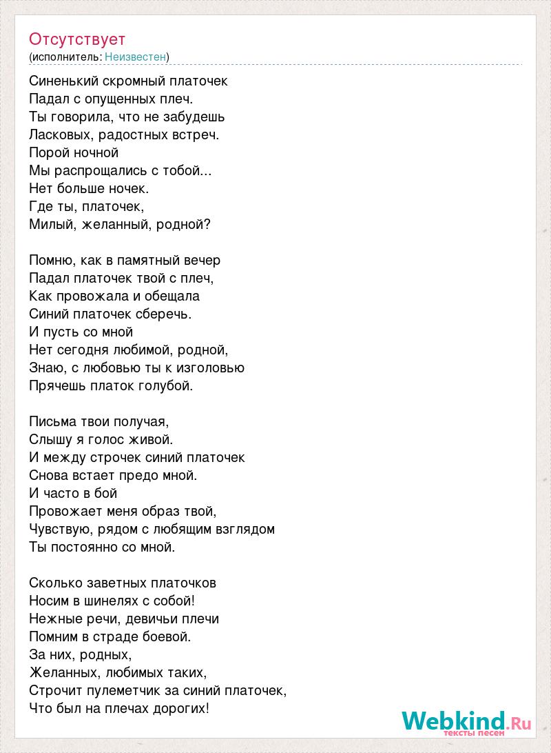 Синенький скромный платочек Падал с опущенных плеч. Ты говорила, что не забудешь Ласковых, радостных встреч. Порой ночной Мы распрощались с тобой... Нет больше ночек. Где ты, платочек, Милый, желанный, родной? Помню, как в памятный вечер Падал платочек твой с плеч, Как провожала и обещала Синий платочек сберечь. И пусть со мной Нет сегодня любимой, родной, Знаю, с любовью ты к изголовью Прячешь платок голубой. Письма твои получая, Слышу я голос живой. И между строчек синий платочек Снова встает предо мной. И часто в бой Провожает меня образ твой, Чувствую, рядом с любящим взглядом Ты постоянно со мной. Сколько заветных платочков Носим в шинелях с собой! Нежные речи, девичьи плечи Помним в страде боевой. За них, родных, Желанных, любимых таких, Строчит пулеметчик за синий платочек, Что был на плечах дорогих!