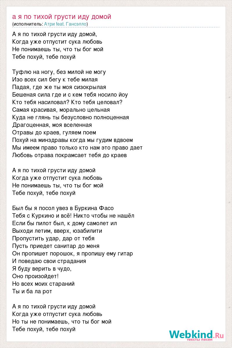А я по тихой грусти иду домой, Когда уже отпустит сука любовь Не понимаешь ты, что ты бог мой Тебе похуй, тебе похуй Туфлю на ногу, без милой не могу Изо всех сил бегу к тебе милая Падая, где же ты моя сизокрылая Бешеная сила где и с кем тебя носило йоу Кто тебя насиловал? Кто тебя целовал? Самая красивая, морально цельная Куда не глянь ты безусловно полноценная Драгоценная, моя вселенная Отравы до краев, гуляем поем Похуй на минздравы когда мы гудим вдвоем Мы имеем право только кто нам это право дает Любовь отрава покрамсает тебя до краев А я по тихой грусти иду домой Когда уже отпустит сука любовь Не понимаешь ты, что ты бог мой Тебе похуй, тебе похуй Был бы я посол увез в Буркина Фасо Тебя с Куркино и всё! Никто чтобы не нашёл Если бы пилот был, к дому самолет ил Выходи летим, вверх, юзабилити Пропустить удар, дар от тебя Пусть приедет санитар до меня Он пропишет порошок, я пропишу ему гитар И поведаю свои страдания Я буду верить в чудо, Оно произойдет! Но всех моих стараний Ты и ба ла рот А я по тихой грусти иду домой Когда уже отпустит сука любовь Но ты не понимаешь, что ты бог мой Тебе похуй, тебе похуй