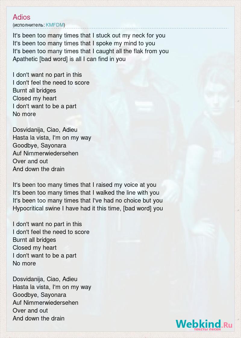 It's been too many times that I stuck out my neck for you It's been too many times that I spoke my mind to you It's been too many times that I caught all the flak from you Apathetic [bad word] is all I can find in you I don't want no part in this I don't feel the need to score Burnt all bridges Closed my heart I don't want to be a part No more Dosvidanija, Ciao, Adieu Hasta la vista, I'm on my way Goodbye, Sayonara Auf Nimmerwiedersehen Over and out And down the drain It's been too many times that I raised my voice at you It's been too many times that I walked the line with you It's been too many times that I've had no choice but you Hypocritical swine I have had it this time, [bad word] you I don't want no part in this I don't feel the need to score Burnt all bridges Closed my heart I don't want to be a part No more Dosvidanija, Ciao, Adieu Hasta la vista, I'm on my way Goodbye, Sayonara Auf Nimmerwiedersehen Over and out And down the drain