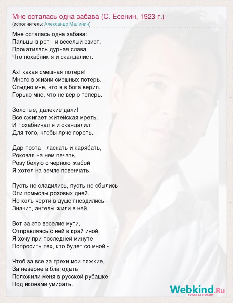 Мне осталась одна забава: Пальцы в рот - и веселый свист. Прокатилась дурная слава, Что похабник я и скандалист. Ах! какая смешная потеря! Много в жизни смешных потерь. Стыдно мне, что я в бога верил. Горько мне, что не верю теперь. Золотые, далекие дали! Все сжигает житейская мреть. И похабничал я и скандалил Для того, чтобы ярче гореть. Дар поэта - ласкать и карябать, Роковая на нем печать. Розу белую с черною жабой Я хотел на земле повенчать. Пусть не сладились, пусть не сбылись Эти помыслы розовых дней. Но коль черти в душе гнездились - Значит, ангелы жили в ней. Вот за это веселие мути, Отправляясь с ней в край иной, Я хочу при последней минуте Попросить тех, кто будет со мной,- Чтоб за все за грехи мои тяжкие, За неверие в благодать Положили меня в русской рубашке Под иконами умирать.