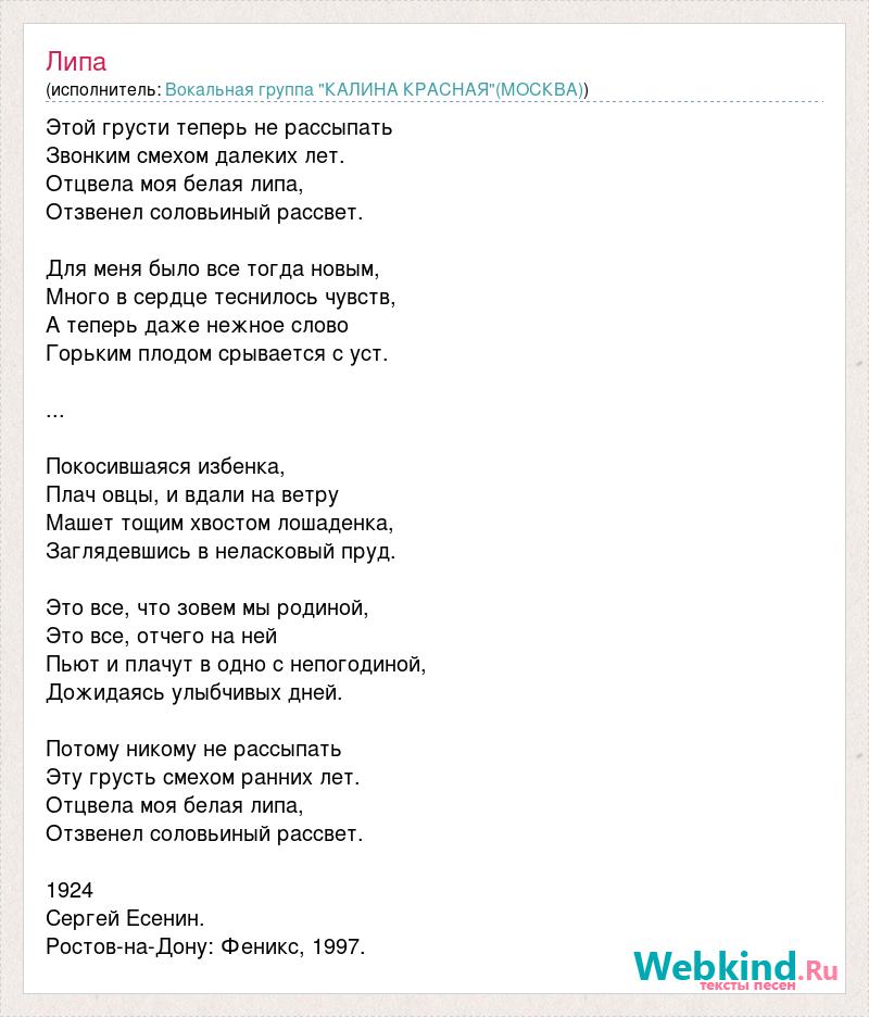 Этой грусти теперь не рассыпать Звонким смехом далеких лет. Отцвела моя белая липа, Отзвенел соловьиный рассвет. Для меня было все тогда новым, Много в сердце теснилось чувств, А теперь даже нежное слово Горьким плодом срывается с уст. ... Покосившаяся избенка, Плач овцы, и вдали на ветру Машет тощим хвостом лошаденка, Заглядевшись в неласковый пруд. Это все, что зовем мы родиной, Это все, отчего на ней Пьют и плачут в одно с непогодиной, Дожидаясь улыбчивых дней. Потому никому не рассыпать Эту грусть смехом ранних лет. Отцвела моя белая липа, Отзвенел соловьиный рассвет. 1924 Сергей Есенин. Ростов-на-Дону: Феникс, 1997.