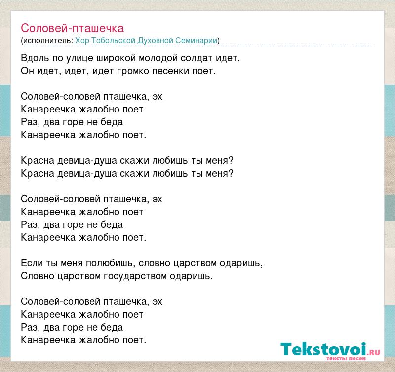Вдоль по улице широкой молодой солдат идет. Он идет, идет, идет громко песенки поет. Соловей-соловей пташечка, эх Канареечка жалобно поет Раз, два горе не беда Канареечка жалобно поет. Красна девица-душа скажи любишь ты меня? Красна девица-душа скажи любишь ты меня? Соловей-соловей пташечка, эх Канареечка жалобно поет Раз, два горе не беда Канареечка жалобно поет. Если ты меня полюбишь, словно царством одаришь, Словно царством государством одаришь. Соловей-соловей пташечка, эх Канареечка жалобно поет Раз, два горе не беда Канареечка жалобно поет.