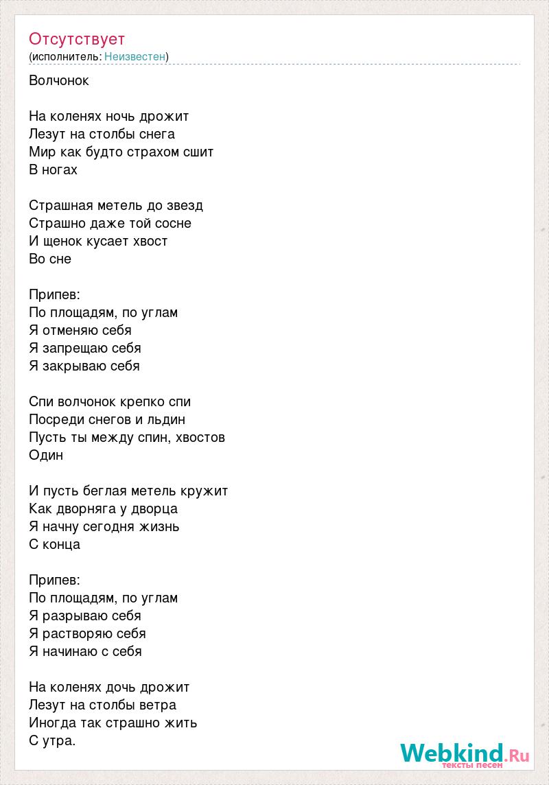 Волчонок На коленях ночь дрожит Лезут на столбы снега Мир как будто страхом сшит В ногах Страшная метель до звезд Страшно даже той сосне И щенок кусает хвост Во сне Припев: По площадям, по углам Я отменяю себя Я запрещаю себя Я закрываю себя Спи волчонок крепко спи Посреди снегов и льдин Пусть ты между спин, хвостов Один И пусть беглая метель кружит Как дворняга у дворца Я начну сегодня жизнь С конца Припев: По площадям, по углам Я разрываю себя Я растворяю себя Я начинаю с себя На коленях дочь дрожит Лезут на столбы ветра Иногда так страшно жить С утра.