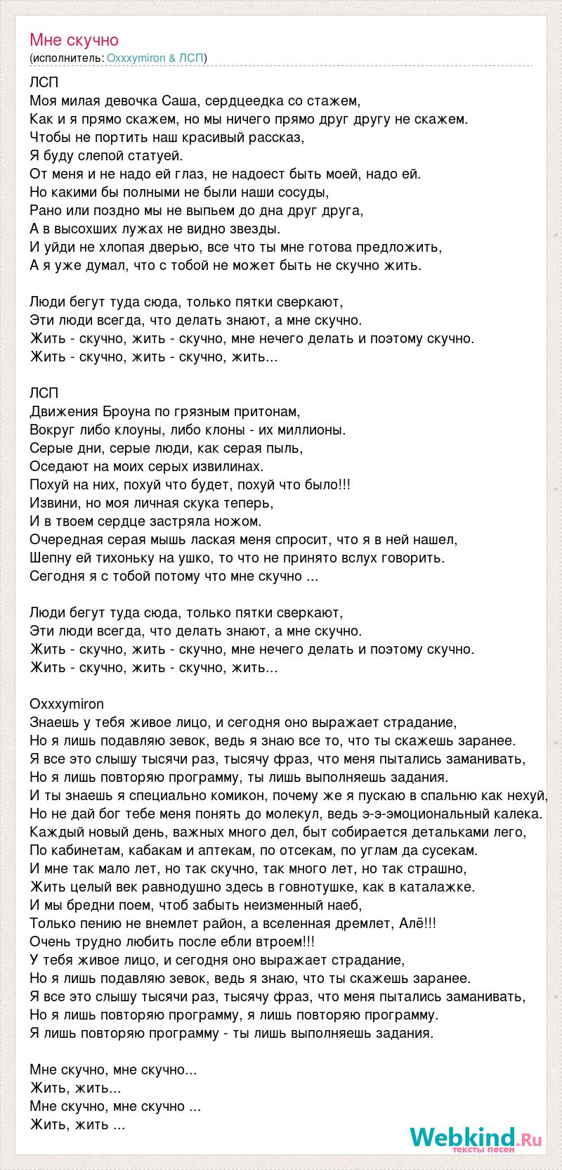 ЛСП Моя милая девочка Саша, сердцеедка со стажем, Как и я прямо скажем, но мы ничего прямо друг другу не скажем. Чтобы не портить наш красивый рассказ, Я буду слепой статуей. От меня и не надо ей глаз, не надоест быть моей, надо ей. Но какими бы полными не были наши сосуды, Рано или поздно мы не выпьем до дна друг друга, А в высохших лужах не видно звезды. И уйди не хлопая дверью, все что ты мне готова предложить, А я уже думал, что с тобой не может быть не скучно жить. Люди бегут туда сюда, только пятки сверкают, Эти люди всегда, что делать знают, а мне скучно. Жить - скучно, жить - скучно, мне нечего делать и поэтому скучно. Жить - скучно, жить - скучно, жить... ЛСП Движения Броуна по грязным притонам, Вокруг либо клоуны, либо клоны - их миллионы. Серые дни, серые люди, как серая пыль, Оседают на моих серых извилинах. Похуй на них, похуй что будет, похуй что было!!! Извини, но моя личная скука теперь, И в твоем сердце застряла ножом. Очередная серая мышь лаская меня спросит, что я в ней нашел, Шепну ей тихоньку на ушко, то что не принято вслух говорить. Сегодня я с тобой потому что мне скучно ... Люди бегут туда сюда, только пятки сверкают, Эти люди всегда, что делать знают, а мне скучно. Жить - скучно, жить - скучно, мне нечего делать и поэтому скучно. Жить - скучно, жить - скучно, жить... Oxxxymiron Знаешь у тебя живое лицо, и сегодня оно выражает страдание, Но я лишь подавляю зевок, ведь я знаю все то, что ты скажешь заранее. Я все это слышу тысячи раз, тысячу фраз, что меня пытались заманивать, Но я лишь повторяю программу, ты лишь выполняешь задания. И ты знаешь я специально комикон, почему же я пускаю в спальню как нехуй, Но не дай бог тебе меня понять до молекул, ведь э-э-эмоциональный калека. Каждый новый день, важных много дел, быт собирается детальками лего, По кабинетам, кабакам и аптекам, по отсекам, по углам да сусекам. И мне так мало лет, но так скучно, так много лет, но так страшно, Жить целый век равнодушно здесь в говнотушке, как в каталажке. И мы бредни поем, чтоб забыть неизменный наеб, Только пению не внемлет район, а вселенная дремлет, Алё!!! Очень трудно любить после ебли втроем!!! У тебя живое лицо, и сегодня оно выражает страдание, Но я лишь подавляю зевок, ведь я знаю, что ты скажешь заранее. Я все это слышу тысячи раз, тысячу фраз, что меня пытались заманивать, Но я лишь повторяю программу, я лишь повторяю программу. Я лишь повторяю программу - ты лишь выполняешь задания. Мне скучно, мне скучно... Жить, жить... Мне скучно, мне скучно ... Жить, жить ...
