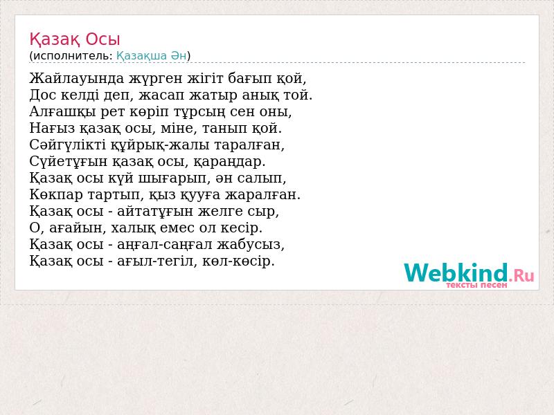 Жайлауында жүрген жігіт бағып қой, Дос келді деп, жасап жатыр анық той. Алғашқы рет көріп тұрсың сен оны, Нағыз қазақ осы, міне, танып қой. Сәйгүлікті құйрық-жалы таралған, Сүйетұғын қазақ осы, қараңдар. Қазақ осы күй шығарып, ән салып, Көкпар тартып, қыз қууға жаралған. Қазақ осы - айтатұғын желге сыр, О, ағайын, халық емес ол кесір. Қазақ осы - аңғал-саңғал жабусыз, Қазақ осы - ағыл-тегіл, көл-көсір.