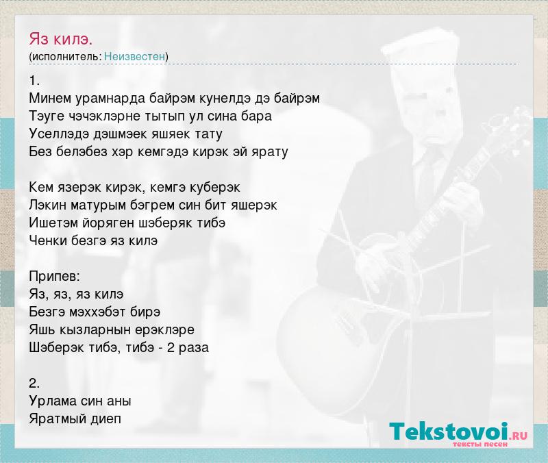 1. Минем урамнарда байрэм кунелдэ дэ байрэм Тэуге чэчэклэрне тытып ул сина бара Уселлэдэ дэшмэек яшяек тату Без белэбез хэр кемгэдэ кирэк эй ярату Кем язерэк кирэк, кемгэ куберэк Лэкин матурым бэгрем син бит яшерэк Ишетэм йоряген шэберяк тибэ Ченки безгэ яз килэ Припев: Яз, яз, яз килэ Безгэ мэххэбэт бирэ Яшь кызларнын ерэклэре Шэберэк тибэ, тибэ - 2 раза 2. Урлама син аны Яратмый диеп