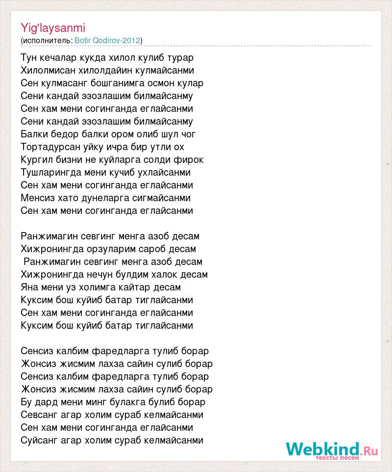Тун кечалар кукда хилол кулиб турар Хилолмисан хилолдайин кулмайсанми Сен кулмасанг бошганимга осмон кулар Сени кандай эзозлашим билмайсанму Сен хам мени согинганда еглайсанми Сени кандай эзозлашим билмайсанму Балки бедор балки ором олиб шул чог Тортадурсан уйку ичра бир утли ох Кургил бизни не куйларга солди фирок Тушларингда мени кучиб ухлайсанми Сен хам мени согинганда еглайсанми Менсиз хато дунеларга сигмайсанми Сен хам мени согинганда еглайсанми Ранжимагин севгинг менга азоб десам Хижронингда орзуларим сароб десам Ранжимагин севгинг менга азоб десам Хижронингда нечун булдим халок десам Яна мени уз холимга кайтар десам Куксим бош куйиб батар тиглайсанми Сен хам мени согинганда еглайсанми Куксим бош куйиб батар тиглайсанми Сенсиз калбим фаредларга тулиб борар Жонсиз жисмим лахза сайин сулиб борар Сенсиз калбим фаредларга тулиб борар Жонсиз жисмим лахза сайин сулиб борар Бу дард мени минг булакга булиб борар Севсанг агар холим сураб келмайсанми Сен хам мени согинганда еглайсанми Суйсанг агар холим сураб келмайсанми