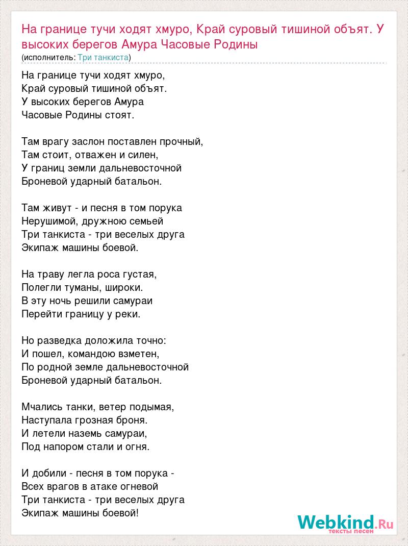 На границе тучи ходят хмуро, Край суровый тишиной объят. У высоких берегов Амура Часовые Родины стоят. Там врагу заслон поставлен прочный, Там стоит, отважен и силен, У границ земли дальневосточной Броневой ударный батальон. Там живут - и песня в том порука Нерушимой, дружною семьей Три танкиста - три веселых друга Экипаж машины боевой. На траву легла роса густая, Полегли туманы, широки. В эту ночь решили самураи Перейти границу у реки. Но разведка доложила точно: И пошел, командою взметен, По родной земле дальневосточной Броневой ударный батальон. Мчались танки, ветер подымая, Наступала грозная броня. И летели наземь самураи, Под напором стали и огня. И добили - песня в том порука - Всех врагов в атаке огневой Три танкиста - три веселых друга Экипаж машины боевой!