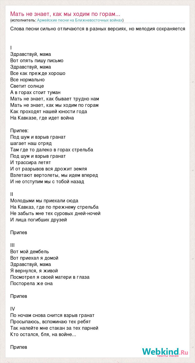 Слова песни сильно отличаются в разных версиях, но мелодия сохраняется I Здравствуй, мама Вот опять пишу письмо Здравствуй, мама Все как прежде хорошо Все нормально Светит солнце А в горах стоит туман Мать не знает, как бывает трудно нам Мать не знает, как мы ходим по горам Как проходят нашей юности года На Кавказе, где идет война Припев: Под шум и взрыв гранат шагает наш отряд Там где то далеко в горах стрельба Под шум и взрыв гранат И трассира летят И от разрывов вся дрожит земля Взлетают вертолеты, мы идем вперед И не отступим мы с тобой назад II Молодыми мы приехали сюда На Кавказ, где по прежнему стрельба Не забыть мне тех суровых дней-ночей И лица погибших друзей Припев III Вот мой дембель Вот приехал я домой Здравствуй, мама Я вернулся, я живой Посмотрел я своей матери в глаза Посторела же она Припев IV По ночам снова снится взрыв гранат Просыпаюсь, вспоминаю тех ребят Так налейте мне стакан за тех парней Кто остался, бля, на войне... Припев