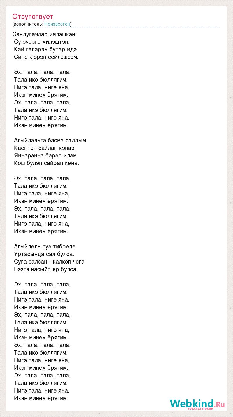 Сандугачлар иялэшкэн Су эчэргэ милэштэн. Кай гэларэм бутар идэ Сине кюрэп сёйлэшсэм. Эх, тала, тала, тала, Тала икэ бюллягим. Нигэ тала, нигэ яна, Икэн минем ёрягим. Эх, тала, тала, тала, Тала икэ бюллягим. Нигэ тала, нигэ яна, Икэн минем ёрягим. Агыйдэльгэ басма салдым Каеннэн сайлап кэнаэ. Яннарэнна барэр идэм Кош булэп сайрап кёна. Эх, тала, тала, тала, Тала икэ бюллягим. Нигэ тала, нигэ яна, Икэн минем ёрягим. Эх, тала, тала, тала, Тала икэ бюллягим. Нигэ тала, нигэ яна, Икэн минем ёрягим. Агыйдель суэ тибреле Уртасында сал булса. Суга салсан - калкэп чэга Бэзгэ насыйп яр булса. Эх, тала, тала, тала, Тала икэ бюллягим. Нигэ тала, нигэ яна, Икэн минем ёрягим. Эх, тала, тала, тала, Тала икэ бюллягим. Нигэ тала, нигэ яна, Икэн минем ёрягим. Эх, тала, тала, тала, Тала икэ бюллягим. Нигэ тала, нигэ яна, Икэн минем ёрягим. Эх, тала, тала, тала, Тала икэ бюллягим. Нигэ тала, нигэ яна, Икэн минем ёрягим.
