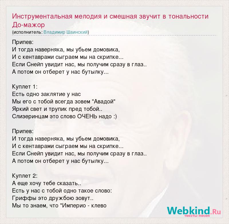 Припев: И тогда наверняка, мы убьем домовика, И с кентаврами сыграем мы на скрипке... Если Снейп увидит нас, мы получим сразу в глаз.. А потом он отберет у нас бутылку... Куплет 1: Есть одно заклятие у нас Мы его с тобой всегда зовем "Авадой" Яркий свет и трупик пред тобой.. Слизеринцам это слово ОЧЕНЬ надо :) Припев: И тогда наверняка, мы убьем домовика, И с кентаврами сыграем мы на скрипке... Если Снейп увидит нас, мы получим сразу в глаз.. А потом он отберет у нас бутылку... Куплет 2: А еще хочу тебе сказать.. Есть у нас с тобой одно такое слово: Гриффы это дружбою зовут.. Мы то знаем, что "Империо - клево