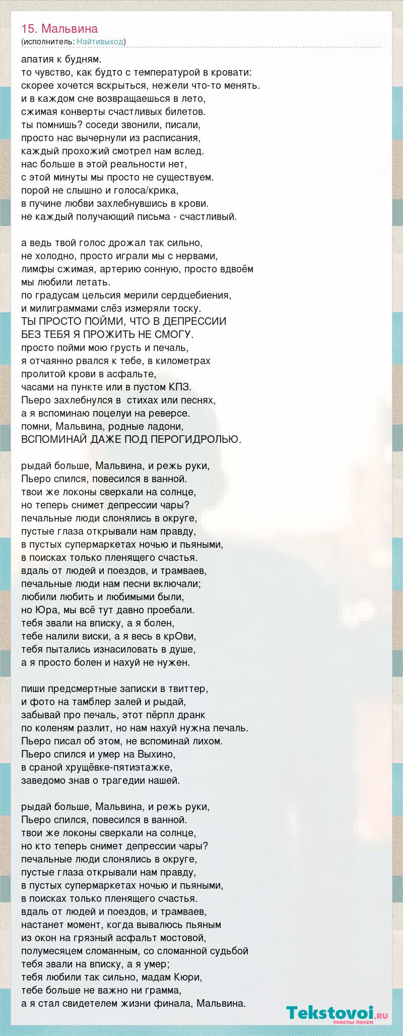 апатия к будням. то чувство, как будто с температурой в кровати: скорее хочется вскрыться, нежели что-то менять. и в каждом сне возвращаешься в лето, сжимая конверты счастливых билетов. ты помнишь? соседи звонили, писали, просто нас вычернули из расписания, каждый прохожий смотрел нам вслед. нас больше в этой реальности нет, с этой минуты мы просто не существуем. порой не слышно и голоса/крика, в пучине любви захлебнувшись в крови. не каждый получающий письма - счастливый. а ведь твой голос дрожал так сильно, не холодно, просто играли мы с нервами, лимфы сжимая, артерию сонную, просто вдвоём мы любили летать. по градусам цельсия мерили сердцебиения, и милиграммами слёз измеряли тоску. ТЫ ПРОСТО ПОЙМИ, ЧТО В ДЕПРЕССИИ БЕЗ ТЕБЯ Я ПРОЖИТЬ НЕ СМОГУ. просто пойми мою грусть и печаль, я отчаянно рвался к тебе, в километрах пролитой крови в асфальте, часами на пункте или в пустом КПЗ. Пьеро захлебнулся в стихах или песнях, а я вспоминаю поцелуи на реверсе. помни, Мальвина, родные ладони, ВСПОМИНАЙ ДАЖЕ ПОД ПЕРОГИДРОЛЬЮ. рыдай больше, Мальвина, и режь руки, Пьеро спился, повесился в ванной. твои же локоны сверкали на солнце, но теперь снимет депрессии чары? печальные люди слонялись в округе, пустые глаза открывали нам правду, в пустых супермаркетах ночью и пьяными, в поисках только пленящего счастья. вдаль от людей и поездов, и трамваев, печальные люди нам песни включали; любили любить и любимыми были, но Юра, мы всё тут давно проебали. тебя звали на вписку, а я болен, тебе налили виски, а я весь в крОви, тебя пытались изнасиловать в душе, а я просто болен и нахуй не нужен. пиши предсмертные записки в твиттер, и фото на тамблер залей и рыдай, забывай про печаль, этот пёрпл дранк по коленям разлит, но нам нахуй нужна печаль. Пьеро писал об этом, не вспоминай лихом. Пьеро спился и умер на Выхино, в сраной хрущёвке-пятиэтажке, заведомо знав о трагедии нашей. рыдай больше, Мальвина, и режь руки, Пьеро спился, повесился в ванной. твои же локоны сверкали на солнце, но кто теперь снимет депрессии чары? печальные люди слонялись в округе, пустые глаза открывали нам правду, в пустых супермаркетах ночью и пьяными, в поисках только пленящего счастья. вдаль от людей и поездов, и трамваев, настанет момент, когда вывалюсь пьяным из окон на грязный асфальт мостовой, полумесяцем сломанным, со сломанной судьбой тебя звали на вписку, а я умер; тебя любили так сильно, мадам Кюри, тебе больше не важно ни грамма, а я стал свидетелем жизни финала, Мальвина.
