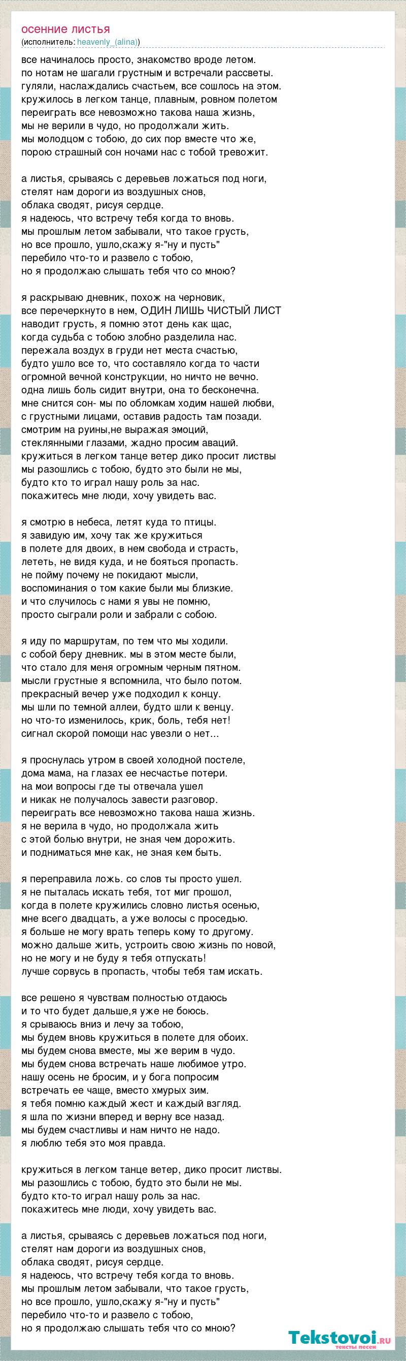 все начиналось просто, знакомство вроде летом. по нотам не шагали грустным и встречали рассветы. гуляли, наслаждались счастьем, все сошлось на этом. кружилось в легком танце, плавным, ровном полетом переиграть все невозможно такова наша жизнь, мы не верили в чудо, но продолжали жить. мы молодцом с тобою, до сих пор вместе что же, порою страшный сон ночами нас с тобой тревожит. а листья, срываясь с деревьев ложаться под ноги, стелят нам дороги из воздушных снов, облака сводят, рисуя сердце. я надеюсь, что встречу тебя когда то вновь. мы прошлым летом забывали, что такое грусть, но все прошло, ушло,скажу я-"ну и пусть" перебило что-то и развело с тобою, но я продолжаю слышать тебя что со мною? я раскрываю дневник, похож на черновик, все перечеркнуто в нем, ОДИН ЛИШЬ ЧИСТЫЙ ЛИСТ наводит грусть, я помню этот день как щас, когда судьба с тобою злобно разделила нас. пережала воздух в груди нет места счастью, будто ушло все то, что составляло когда то части огромной вечной конструкции, но ничто не вечно. одна лишь боль сидит внутри, она то бесконечна. мне снится сон- мы по обломкам ходим нашей любви, с грустными лицами, оставив радость там позади. смотрим на руины,не выражая эмоций, стеклянными глазами, жадно просим аваций. кружиться в легком танце ветер дико просит листвы мы разошлись с тобою, будто это были не мы, будто кто то играл нашу роль за нас. покажитесь мне люди, хочу увидеть вас. я смотрю в небеса, летят куда то птицы. я завидую им, хочу так же кружиться в полете для двоих, в нем свобода и страсть, лететь, не видя куда, и не бояться пропасть. не пойму почему не покидают мысли, воспоминания о том какие были мы близкие. и что случилось с нами я увы не помню, просто сыграли роли и забрали с собою. я иду по маршрутам, по тем что мы ходили. с собой беру дневник. мы в этом месте были, что стало для меня огромным черным пятном. мысли грустные я вспомнила, что было потом. прекрасный вечер уже подходил к концу. мы шли по темной аллеи, будто шли к венцу. но что-то изменилось, крик, боль, тебя нет! сигнал скорой помощи нас увезли о нет... я проснулась утром в своей холодной постеле, дома мама, на глазах ее несчастье потери. на мои вопросы где ты отвечала ушел и никак не получалось завести разговор. переиграть все невозможно такова наша жизнь. я не верила в чудо, но продолжала жить с этой болью внутри, не зная чем дорожить. и подниматься мне как, не зная кем быть. я переправила ложь. со слов ты просто ушел. я не пыталась искать тебя, тот миг прошол, когда в полете кружились словно листья осенью, мне всего двадцать, а уже волосы с проседью. я больше не могу врать теперь кому то другому. можно дальше жить, устроить свою жизнь по новой, но не могу и не буду я тебя отпускать! лучше сорвусь в пропасть, чтобы тебя там искать. все решено я чувствам полностью отдаюсь и то что будет дальше,я уже не боюсь. я срываюсь вниз и лечу за тобою, мы будем вновь кружиться в полете для обоих. мы будем снова вместе, мы же верим в чудо. мы будем снова встречать наше любимое утро. нашу осень не бросим, и у бога попросим встречать ее чаще, вместо хмурых зим. я тебя помню каждый жест и каждый взгляд. я шла по жизни вперед и верну все назад. мы будем счастливы и нам ничто не надо. я люблю тебя это моя правда. кружиться в легком танце ветер, дико просит листвы. мы разошлись с тобою, будто это были не мы. будто кто-то играл нашу ро