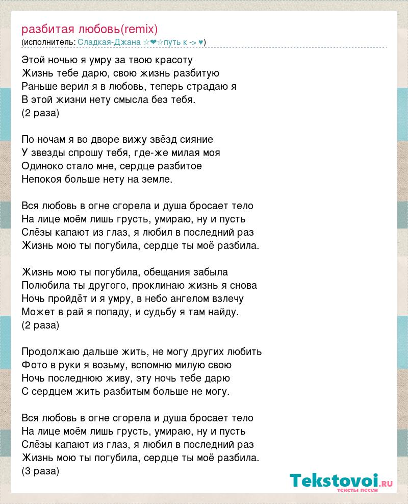 Этой ночью я умру за твою красоту Жизнь тебе дарю, свою жизнь разбитую Раньше верил я в любовь, теперь страдаю я В этой жизни нету смысла без тебя. (2 раза) По ночам я во дворе вижу звёзд сияние У звезды спрошу тебя, где-же милая моя Одиноко стало мне, сердце разбитое Непокоя больше нету на земле. Вся любовь в огне сгорела и душа бросает тело На лице моём лишь грусть, умираю, ну и пусть Слёзы капают из глаз, я любил в последний раз Жизнь мою ты погубила, сердце ты моё разбила. Жизнь мою ты погубила, обещания забыла Полюбила ты другого, проклинаю жизнь я снова Ночь пройдёт и я умру, в небо ангелом взлечу Может в рай я попаду, и судьбу я там найду. (2 раза) Продолжаю дальше жить, не могу других любить Фото в руки я возьму, вспомню милую свою Ночь последнюю живу, эту ночь тебе дарю С сердцем жить разбитым больше не могу. Вся любовь в огне сгорела и душа бросает тело На лице моём лишь грусть, умираю, ну и пусть Слёзы капают из глаз, я любил в последний раз Жизнь мою ты погубила, сердце ты моё разбила. (3 раза)