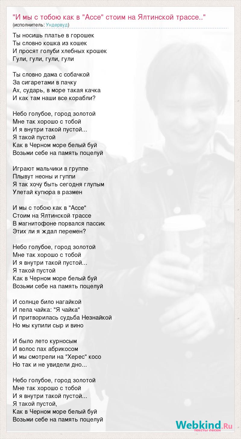 Ты носишь платье в горошек Ты словно кошка из кошек И просят голуби хлебных крошек Гули, гули, гули, гули Ты словно дама с собачкой За сигаретами в пачку Ах, сударь, в море такая качка И как там наши все корабли? Небо голубое, город золотой Мне так хорошо с тобой И я внутри такой пустой... Я такой пустой Как в Черном море белый буй Возьми себе на память поцелуй Играют мальчики в группе Плывут неоны и гуппи Я так хочу быть сегодня глупым Улетай купюра в размен И мы с тобою как в "Ассе" Стоим на Ялтинской трассе В магнитофоне порвался пассик Этих ли я ждал перемен? Небо голубое, город золотой Мне так хорошо с тобой И я внутри такой пустой... Я такой пустой Как в Черном море белый буй Возьми себе на память поцелуй И солнце било нагайкой И пела чайка: "Я чайка" И притворилась судьба Незнайкой Но мы купили сыр и вино И было лето курносым И волос пах абрикосом И мы смотрели на "Херес" косо Но так и не увидели дно... Небо голубое, город золотой Мне так хорошо с тобой И я внутри такой пустой... Я такой пустой, Как в Черном море белый буй Возьми себе на память поцелуй
