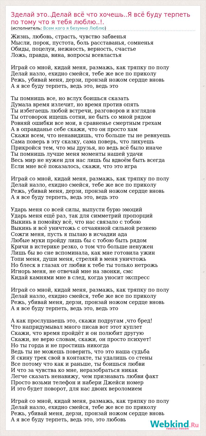 Жизнь, любовь, страсть, чувство забвенья Мысли, порок, пустота, боль расставанья, сомненья Обиды, поцелуи, нежность, верность, счастье Ложь, правда, вина, вопросы всевластья Играй со мной, кидай меня, размажь, как тряпку по полу Делай назло, ехидно смейся, тебе же все по приколу Режь, убивай меня, дерзи, пронзай ножом сердце вновь А я все буду терпеть, ведь это, ведь это Ты помнишь все, но вслух боишься сказать Думала время излечит, но время против опять Ты избегаешь любой встречи, разговоров и взглядов Ты отговорок ищешь сотни, не быть со мной рядом Ровняй ошибки все мои, в сравненье смертным грехам А в оправданье себе скажи, что он просто хам Скажи всем, что ненавидишь, что больше ты не ревнуешь Сама поверь в эту сказку, сама поверь, что ликуешь Прикройся тем, что мы друзья, но ведь всё было иначе Ты помнишь лучше меня моменты нашей удачи Весь мир не нужен для нас лишь бы вдвоём быть всегда Если мне всё показалось, скажи, что это игра Играй со мной, кидай меня, размажь, как тряпку по полу Делай назло, ехидно смейся, тебе же все по приколу Режь, убивай меня, дерзи, пронзай ножом сердце вновь А я все буду терпеть, ведь это, ведь это Ударь меня со всей силы, выпусти бурю эмоций Ударь меня ещё раз, так для симметрий пропорций Выкинь в помойку всё, что нас связало с тобою Выкинь и всё уничтожь с отчаянной сильной резнею Сожги меня, пусть я пылаю в исчадии ада Любые муки пройду лишь бы с тобою быть рядом Кричи в истерике резко, о том что больше ненужен Лишь бы во сне вспоминала, как мне готовила ужин Топи меня, души меня, стреляй в меня уничтожь Но блеск в глазах от любви к тебе ты только нетрожь Игнорь меня, не отвечай мне на звонки, смс Кидай камнями мне в след, когда уносит экспресс Играй со мной, кидай меня, размажь, как тряпку по полу Делай назло, ехидно смейся, тебе же все по приколу Режь, убивай меня, дерзи, пронзай ножом сердце вновь А я все буду терпеть, ведь это, ведь это А как прослушаешь это, скажи подругам ,что бред! Что напридумывал много писав вот этот куплет Скажи, что время пройдёт и он полюбит другую Скажи, не верю словам, скажи, он просто психует! Но ты горда и не простишь никогда Ведь ты не можешь поверить, что это наша судьба Я скину трек свой в контакте, ты удалишь со стены Все потому что как и раньше, ты боишься любви И что за чувства ко мне, неразобраться никак Легче сказать ненавижу, чем признавать любви факт Просто возьми телефон и набери Джейси номер И это будет поворот, для нас двоих вероломием Играй со мной, кидай меня, размажь, как тряпку по полу Делай назло, ехидно смейся, тебе же все по приколу Режь, убивай меня, дерзи, пронзай ножом сердце вновь А я все буду терпеть, ведь это, это любовь