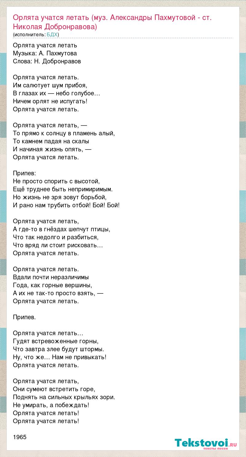 Орлята учатся летать Музыка: А. Пахмутова Слова: Н. Добронравов Орлята учатся летать. Им салютует шум прибоя, В глазах их — небо голубое… Ничем орлят не испугать! Орлята учатся летать. Орлята учатся летать, — То прямо к солнцу в пламень алый, То камнем падая на скалы И начиная жизнь опять, — Орлята учатся летать. Припев: Не просто спорить с высотой, Ещё труднее быть непримиримым. Но жизнь не зря зовут борьбой, И рано нам трубить отбой! Бой! Бой! Орлята учатся летать, А где-то в гнёздах шепчут птицы, Что так недолго и разбиться, Что вряд ли стоит рисковать… Орлята учатся летать. Орлята учатся летать. Вдали почти неразличимы Года, как горные вершины, А их не так-то просто взять, — Орлята учатся летать. Припев. Орлята учатся летать… Гудят встревоженные горны, Что завтра злее будут штормы. Ну, что же… Нам не привыкать! Орлята учатся летать. Орлята учатся летать, Они сумеют встретить горе, Поднять на сильных крыльях зори. Не умирать, а побеждать! Орлята учатся летать! Орлята учатся летать! 1965