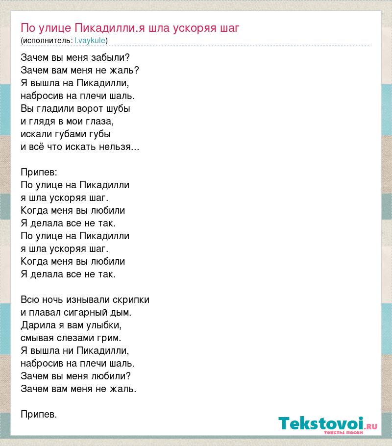 Зачем вы меня забыли? Зачем вам меня не жаль? Я вышла на Пикадилли, набросив на плечи шаль. Вы гладили ворот шубы и глядя в мои глаза, искали губами губы и всё что искать нельзя... Припев: По улице на Пикадилли я шла ускоряя шаг. Когда меня вы любили Я делала все не так. По улице на Пикадилли я шла ускоряя шаг. Когда меня вы любили Я делала все не так. Всю ночь изнывали скрипки и плавал сигарный дым. Дарила я вам улыбки, смывая слезами грим. Я вышла ни Пикадилли, набросив на плечи шаль. Зачем вы меня любили? Зачем вам меня не жаль. Припев.