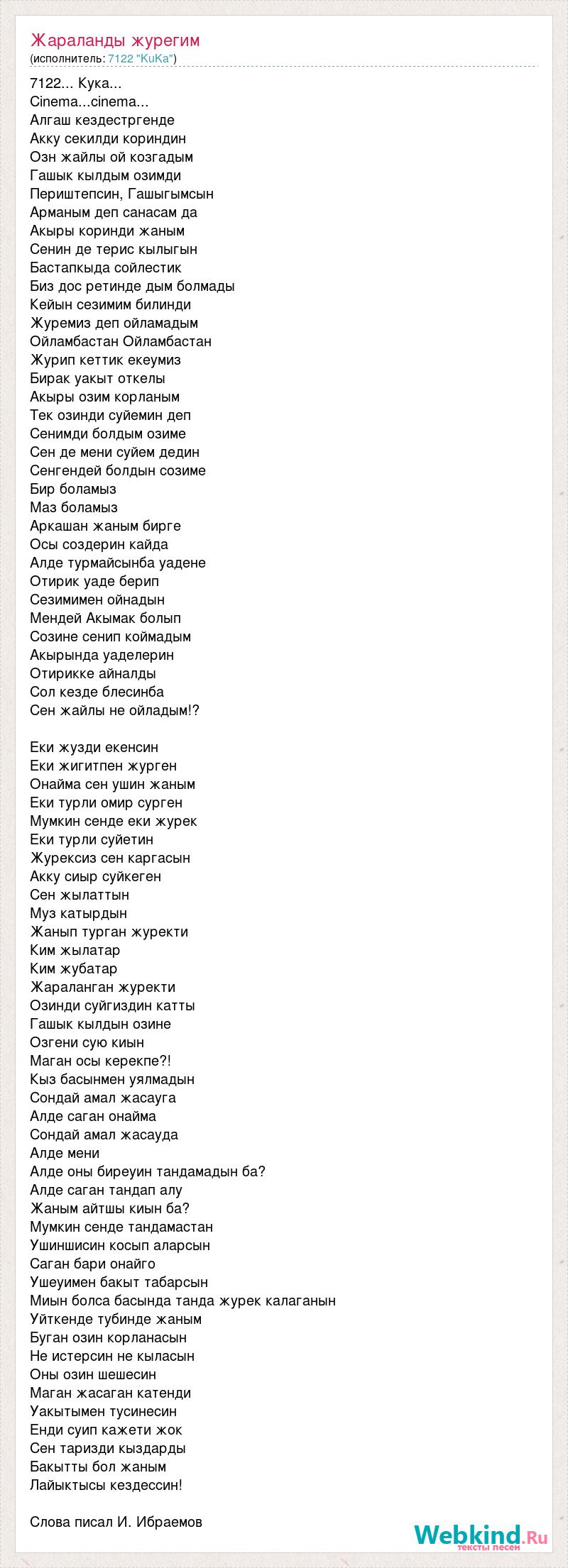 7122... Кука... Cinema...cinema... Алгаш кездестргенде Акку секилди кориндин Озн жайлы ой козгадым Гашык кылдым озимди Периштепсин, Гашыгымсын Арманым деп санасам да Акыры коринди жаным Сенин де терис кылыгын Бастапкыда сойлестик Биз дос ретинде дым болмады Кейын сезимим билинди Журемиз деп ойламадым Ойламбастан Ойламбастан Журип кеттик екеумиз Бирак уакыт откелы Акыры озим корланым Тек озинди суйемин деп Сенимди болдым озиме Сен де мени суйем дедин Сенгендей болдын созиме Бир боламыз Маз боламыз Аркашан жаным бирге Осы создерин кайда Алде турмайсынба уадене Отирик уаде берип Сезимимен ойнадын Мендей Акымак болып Созине сенип коймадым Акырында уаделерин Отирикке айналды Сол кезде блесинба Сен жайлы не ойладым!? Еки жузди екенсин Еки жигитпен журген Онайма сен ушин жаным Еки турли омир сурген Мумкин сенде еки журек Еки турли суйетин Журексиз сен каргасын Акку сиыр суйкеген Сен жылаттын Муз катырдын Жанып турган журекти Ким жылатар Ким жубатар Жараланган журекти Озинди суйгиздин катты Гашык кылдын озине Озгени сую киын Маган осы керекпе?! Кыз басынмен уялмадын Сондай амал жасауга Алде саган онайма Сондай амал жасауда Алде мени Алде оны биреуин тандамадын ба? Алде саган тандап алу Жаным айтшы киын ба? Мумкин сенде тандамастан Ушиншисин косып аларсын Саган бари онайго Ушеуимен бакыт табарсын Миын болса басында танда журек калаганын Уйткенде тубинде жаным Буган озин корланасын Не истерсин не кыласын Оны озин шешесин Маган жасаган катенди Уакытымен тусинесин Енди суип кажети жок Сен таризди кыздарды Бакытты бол жаным Лайыктысы кездессин! Слова писал И. Ибраемов