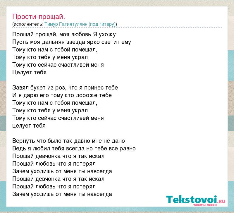 Прощай прощай, моя любовь Я ухожу Пусть моя дальняя звезда ярко светит ему Тому кто нам с тобой помешал, Тому кто тебя у меня украл Тому кто сейчас счастливей меня Целует тебя Завял букет из роз, что я принес тебе И я дарю его тому кто дороже тебе Тому кто нам с тобой помешал, Тому кто тебя у меня украл Тому кто сейчас счастливей меня целует тебя Вернуть что было так давно мне не дано Ведь я любил тебя всегда но тебе все равно Прощай девчонка что я так искал Прощай любовь что я потерял Зачем уходишь от меня ты навсегда Прощай девчонка что я так искал Прощай любовь что я потерял Зачем уходишь от меня ты навсегда