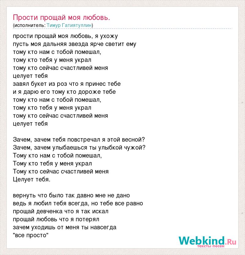 прости прощай моя любовь, я ухожу пусть моя дальняя звезда ярче светит ему тому кто нам с тобой помешал, тому кто тебя у меня украл тому кто сейчас счастливей меня целует тебя завял букет из роз что я принес тебе и я дарю его тому кто дороже тебе тому кто нам с тобой помешал, тому кто тебя у меня украл тому кто сейчас счастливей меня целует тебя Зачем, зачем тебя повстречал я этой весной? Зачем, зачем улыбаешься ты улыбкой чужой? Тому кто нам с тобой помешал, Тому кто тебя у меня украл Тому кто сейчас счастливей меня Целует тебя. вернуть что было так давно мне не дано ведь я любил тебя всегда, но тебе все равно прощай девченка что я так искал прощай любовь что я потерял зачем уходишь от меня ты навсегда "все просто"