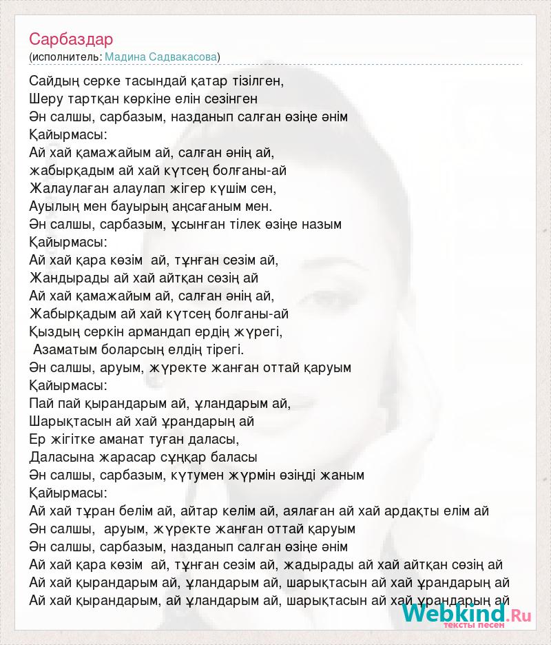 Сайдың серке тасындай қатар тізілген, Шеру тартқан көркіне елін сезінген Ән салшы, сарбазым, назданып салған өзіңе әнім Қайырмасы: Ай хай қамажайым ай, салған әнің ай, жабырқадым ай хай күтсең болғаны-ай Жалаулаған алаулап жігер күшім сен, Ауылың мен бауырың аңсағаным мен. Ән салшы, сарбазым, ұсынған тілек өзіңе назым Қайырмасы: Ай хай қара көзім ай, тұнған сезім ай, Жандырады ай хай айтқан сөзің ай Ай хай қамажайым ай, салған әнің ай, Жабырқадым ай хай күтсең болғаны-ай Қыздың серкін армандап ердің жүрегі, Азаматым боларсың елдің тірегі. Ән салшы, аруым, жүректе жанған оттай қаруым Қайырмасы: Пай пай қырандарым ай, ұландарым ай, Шарықтасын ай хай ұрандарың ай Ер жігітке аманат туған даласы, Даласына жарасар сұңқар баласы Ән салшы, сарбазым, күтумен жүрмін өзіңді жаным Қайырмасы: Ай хай тұран белім ай, айтар келім ай, аялаған ай хай ардақты елім ай Ән салшы, аруым, жүректе жанған оттай қаруым Ән салшы, сарбазым, назданып салған өзіңе әнім Ай хай қара көзім ай, тұнған сезім ай, жадырады ай хай айтқан сөзің ай Ай хай қырандарым ай, ұландарым ай, шарықтасын ай хай ұрандарың ай Ай хай қырандарым, ай ұландарым ай, шарықтасын ай хай ұрандарың ай