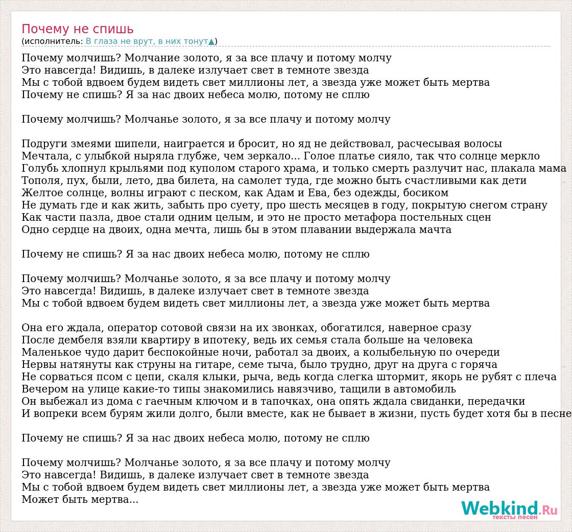 Почему молчишь? Молчание золото, я за все плачу и потому молчу Это навсегда! Видишь, в далеке излучает свет в темноте звезда Мы с тобой вдвоем будем видеть свет миллионы лет, а звезда уже может быть мертва Почему не спишь? Я за нас двоих небеса молю, потому не сплю Почему молчишь? Молчанье золото, я за все плачу и потому молчу Подруги змеями шипели, наиграется и бросит, но яд не действовал, расчесывая волосы Мечтала, с улыбкой ныряла глубже, чем зеркало... Голое платье сияло, так что солнце меркло Голубь хлопнул крыльями под куполом старого храма, и только смерть разлучит нас, плакала мама Тополя, пух, были, лето, два билета, на самолет туда, где можно быть счастливыми как дети Желтое солнце, волны играют с песком, как Адам и Ева, без одежды, босиком Не думать где и как жить, забыть про суету, про шесть месяцев в году, покрытую снегом страну Как части пазла, двое стали одним целым, и это не просто метафора постельных сцен Одно сердце на двоих, одна мечта, лишь бы в этом плавании выдержала мачта Почему не спишь? Я за нас двоих небеса молю, потому не сплю Почему молчишь? Молчанье золото, я за все плачу и потому молчу Это навсегда! Видишь, в далеке излучает свет в темноте звезда Мы с тобой вдвоем будем видеть свет миллионы лет, а звезда уже может быть мертва Она его ждала, оператор сотовой связи на их звонках, обогатился, наверное сразу После дембеля взяли квартиру в ипотеку, ведь их семья стала больше на человека Маленькое чудо дарит беспокойные ночи, работал за двоих, а колыбельную по очереди Нервы натянуты как струны на гитаре, семе тыча, было трудно, друг на друга с горяча Не сорваться псом с цепи, скаля клыки, рыча, ведь когда слегка штормит, якорь не рубят с плеча Вечером на улице какие-то типы знакомились навязчиво, тащили в автомобиль Он выбежал из дома с гаечным ключом и в тапочках, она опять ждала свиданки, передачки И вопреки всем бурям жили долго, были вместе, как не бывает в жизни, пусть будет хотя бы в песне Почему не спишь? Я за нас двоих небеса молю, потому не сплю Почему молчишь? Молчанье золото, я за все плачу и потому молчу Это навсегда! Видишь, в далеке излучает свет в темноте звезда Мы с тобой вдвоем будем видеть свет миллионы лет, а звезда уже может быть мертва Может быть мертва...