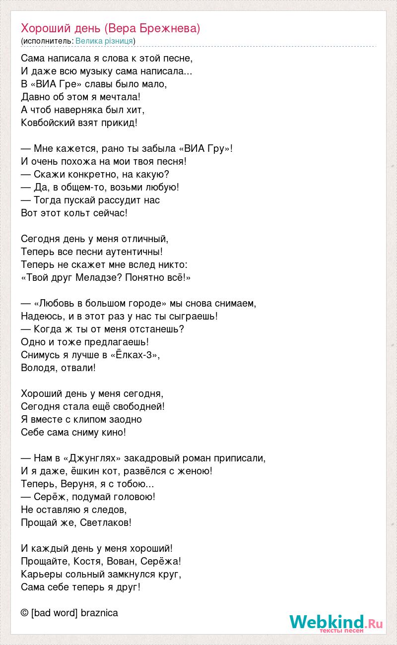 Сама написала я слова к этой песне, И даже всю музыку сама написала... В «ВИА Гре» славы было мало, Давно об этом я мечтала! А чтоб наверняка был хит, Ковбойский взят прикид! — Мне кажется, рано ты забыла «ВИА Гру»! И очень похожа на мои твоя песня! — Скажи конкретно, на какую? — Да, в общем-то, возьми любую! — Тогда пускай рассудит нас Вот этот кольт сейчас! Сегодня день у меня отличный, Теперь все песни аутентичны! Теперь не скажет мне вслед никто: «Твой друг Меладзе? Понятно всё!» — «Любовь в большом городе» мы снова снимаем, Надеюсь, и в этот раз у нас ты сыграешь! — Когда ж ты от меня отстанешь? Одно и тоже предлагаешь! Снимусь я лучше в «Ёлках-3», Володя, отвали! Хороший день у меня сегодня, Сегодня стала ещё свободней! Я вместе с клипом заодно Себе сама сниму кино! — Нам в «Джунглях» закадровый роман приписали, И я даже, ёшкин кот, развёлся с женою! Теперь, Веруня, я с тобою... — Серёж, подумай головою! Не оставляю я следов, Прощай же, Светлаков! И каждый день у меня хороший! Прощайте, Костя, Вован, Серёжа! Карьеры сольный замкнулся круг, Сама себе теперь я друг! © [bad word] braznica