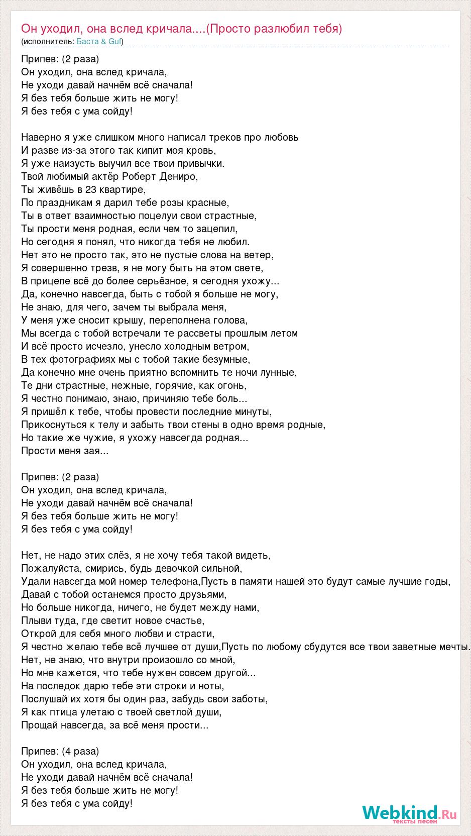Припев: (2 раза) Он уходил, она вслед кричала, Не уходи давай начнём всё сначала! Я без тебя больше жить не могу! Я без тебя с ума сойду! Наверно я уже слишком много написал треков про любовь И разве из-за этого так кипит моя кровь, Я уже наизусть выучил все твои привычки. Твой любимый актёр Роберт Дениро, Ты живёшь в 23 квартире, По праздникам я дарил тебе розы красные, Ты в ответ взаимностью поцелуи свои страстные, Ты прости меня родная, если чем то зацепил, Но сегодня я понял, что никогда тебя не любил. Нет это не просто так, это не пустые слова на ветер, Я совершенно трезв, я не могу быть на этом свете, В прицепе всё до более серьёзное, я сегодня ухожу... Да, конечно навсегда, быть с тобой я больше не могу, Не знаю, для чего, зачем ты выбрала меня, У меня уже сносит крышу, переполнена голова, Мы всегда с тобой встречали те рассветы прошлым летом И всё просто исчезло, унесло холодным ветром, В тех фотографиях мы с тобой такие безумные, Да конечно мне очень приятно вспомнить те ночи лунные, Те дни страстные, нежные, горячие, как огонь, Я честно понимаю, знаю, причиняю тебе боль... Я пришёл к тебе, чтобы провести последние минуты, Прикоснуться к телу и забыть твои стены в одно время родные, Но такие же чужие, я ухожу навсегда родная... Прости меня зая... Припев: (2 раза) Он уходил, она вслед кричала, Не уходи давай начнём всё сначала! Я без тебя больше жить не могу! Я без тебя с ума сойду! Нет, не надо этих слёз, я не хочу тебя такой видеть, Пожалуйста, смирись, будь девочкой сильной, Удали навсегда мой номер телефона,Пусть в памяти нашей это будут самые лучшие годы, Давай с тобой останемся просто друзьями, Но больше никогда, ничего, не будет между нами, Плыви туда, где светит новое счастье, Открой для себя много любви и страсти, Я честно желаю тебе всё лучшее от души,Пусть по любому сбудутся все твои заветные мечты. Нет, не знаю, что внутри произошло со мной, Но мне кажется, что тебе нужен совсем другой... На последок дарю тебе эти строки и ноты, Послушай их хотя бы один раз, забудь свои заботы, Я как птица улетаю с твоей светлой души, Прощай навсегда, за всё меня прости... Припев: (4 раза) Он уходил, она вслед кричала, Не уходи давай начнём всё сначала! Я без тебя больше жить не могу! Я без тебя с ума сойду!