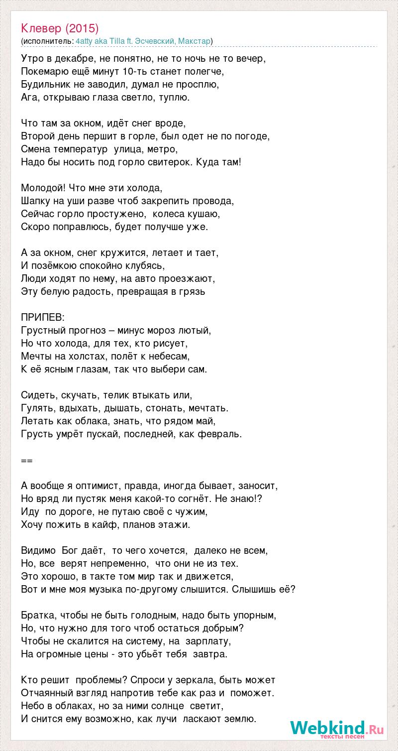 Утро в декабре, не понятно, не то ночь не то вечер, Покемарю ещё минут 10-ть станет полегче, Будильник не заводил, думал не просплю, Ага, открываю глаза светло, туплю. Что там за окном, идёт снег вроде, Второй день першит в горле, был одет не по погоде, Смена температур улица, метро, Надо бы носить под горло свитерок. Куда там! Молодой! Что мне эти холода, Шапку на уши разве чтоб закрепить провода, Сейчас горло простужено, колеса кушаю, Скоро поправлюсь, будет получше уже. А за окном, снег кружится, летает и тает, И позёмкою спокойно клубясь, Люди ходят по нему, на авто проезжают, Эту белую радость, превращая в грязь ПРИПЕВ: Грустный прогноз – минус мороз лютый, Но что холода, для тех, кто рисует, Мечты на холстах, полёт к небесам, К её ясным глазам, так что выбери сам. Сидеть, скучать, телик втыкать или, Гулять, вдыхать, дышать, стонать, мечтать. Летать как облака, знать, что рядом май, Грусть умрёт пускай, последней, как февраль. == А вообще я оптимист, правда, иногда бывает, заносит, Но вряд ли пустяк меня какой-то согнёт. Не знаю!? Иду по дороге, не путаю своё с чужим, Хочу пожить в кайф, планов этажи. Видимо Бог даёт, то чего хочется, далеко не всем, Но, все верят непременно, что они не из тех. Это хорошо, в такте том мир так и движется, Вот и мне моя музыка по-другому слышится. Слышишь её? Братка, чтобы не быть голодным, надо быть упорным, Но, что нужно для того чтоб остаться добрым? Чтобы не скалится на систему, на зарплату, На огромные цены - это убьёт тебя завтра. Кто решит проблемы? Спроси у зеркала, быть может Отчаянный взгляд напротив тебе как раз и поможет. Небо в облаках, но за ними солнце светит, И снится ему возможно, как лучи ласкают землю.