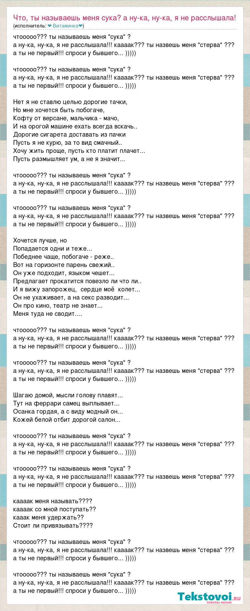 чтооооо??? ты называешь меня "сука" ? а ну-ка, ну-ка, я не расслышала!!! каааак??? ты назвешь меня "стерва" ??? а ты не первый!!! спроси у бывшего... ))))) чтооооо??? ты называешь меня "сука" ? а ну-ка, ну-ка, я не расслышала!!! каааак??? ты назвешь меня "стерва" ??? а ты не первый!!! спроси у бывшего... ))))) Нет я не ставлю целью дорогие тачки, Но мне хочется быть побогаче, Кофту от версане, мальчика - мачо, И на орогой машине ехать всегда вскачь.. Дорогие сигарета доставать из пачки Пусть я не курю, за то вид смачный.. Хочу жить проще, пусть кто платит плачет... Пусть размышляет ум, а не я значит... чтооооо??? ты называешь меня "сука" ? а ну-ка, ну-ка, я не расслышала!!! каааак??? ты назвешь меня "стерва" ??? а ты не первый!!! спроси у бывшего... ))))) чтооооо??? ты называешь меня "сука" ? а ну-ка, ну-ка, я не расслышала!!! каааак??? ты назвешь меня "стерва" ??? а ты не первый!!! спроси у бывшего... ))))) Хочется лучше, но Попадается одни и теже... Победнее чаще, побогаче - реже.. Вот на горизонте парень свежий.. Он уже подходит, языком чешет... Предлагает прокатится повезло ли что ли.. И я вижу запорожец, сердце моё колет... Он не ухаживает, а на секс разводит... Он про кино, театр не знает... Меня туда не сводит.... чтооооо??? ты называешь меня "сука" ? а ну-ка, ну-ка, я не расслышала!!! каааак??? ты назвешь меня "стерва" ??? а ты не первый!!! спроси у бывшего... ))))) чтооооо??? ты называешь меня "сука" ? а ну-ка, ну-ка, я не расслышала!!! каааак??? ты назвешь меня "стерва" ??? а ты не первый!!! спроси у бывшего... ))))) Шагаю домой, мысли голову плавят... Тут на феррари самец выплывает... Осанка гордая, а с виду модный он... Кожей белой отбит дорогой салон... чтооооо??? ты называешь меня "сука" ? а ну-ка, ну-ка, я не расслышала!!! каааак??? ты назвешь меня "стерва" ??? а ты не первый!!! спроси у бывшего... ))))) чтооооо??? ты называешь меня "сука" ? а ну-ка, ну-ка, я не расслышала!!! каааак??? ты назвешь меня "стерва" ??? а ты не первый!!! спроси у бывшего... ))))) каааак меня называть???? каааак со мной поступать?? кааак меня удержать?? Стоит ли привязывать???? чтооооо??? ты называешь меня "сука" ? а ну-ка, ну-ка, я не расслышала!!! каааак??? ты назвешь меня "стерва" ??? а ты не первый!!! спроси у бывшего... ))))) чтооооо??? ты называешь меня "сука" ? а ну-ка, ну-ка, я не расслышала!!! каааак??? ты назвешь меня "стерва" ??? а ты не первый!!! спроси у бывшего... )))))