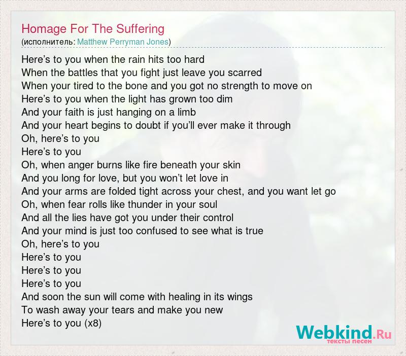 Here’s to you when the rain hits too hard When the battles that you fight just leave you scarred When your tired to the bone and you got no strength to move on Here’s to you when the light has grown too dim And your faith is just hanging on a limb And your heart begins to doubt if you’ll ever make it through Oh, here’s to you Here’s to you Oh, when anger burns like fire beneath your skin And you long for love, but you won’t let love in And your arms are folded tight across your chest, and you want let go Oh, when fear rolls like thunder in your soul And all the lies have got you under their control And your mind is just too confused to see what is true Oh, here’s to you Here’s to you Here’s to you Here’s to you And soon the sun will come with healing in its wings To wash away your tears and make you new Here’s to you (x8)