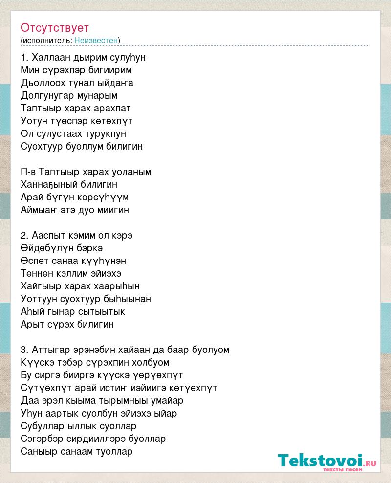 1. Халлаан дьирим сулуhун Мин сүрэхпэр бигиирим Дьоллоох тунал ыйдаҥа Долгунугар мунарым Таптыыр харах арахпат Уотун түөспэр көтөхпүт Ол сулустаах турукпун Суохтуур буоллум билигин П-в Таптыыр харах уоланым Ханнаҕыный билигин Арай бүгүн көрсүhүүм Аймыаҥ этэ дуо миигин 2. Ааспыт кэмим ол кэрэ Өйдөбүлүн бэркэ Өспөт санаа күүhүнэн Төннөн кэллим эйиэхэ Хайгыыр харах хаарыhын Уоттуун суохтуур быhыынан Аhый гынар сытыытык Арыт сүрэх билигин 3. Аттыгар эрэнэбин хайаан да баар буолуом Күүскэ тэбэр сүрэхпин холбуом Бу сиргэ бииргэ күүскэ үөрүөхпүт Сүтүөхпүт арай истиҥ иэйиигэ көтүөхпүт Даа эрэл кыыма тырымныы умайар Уhун аартык суолбун эйиэхэ ыйар Субуллар ыллык суоллар Сэгэрбэр сирдииллэрэ буоллар Саныыр санаам туоллар